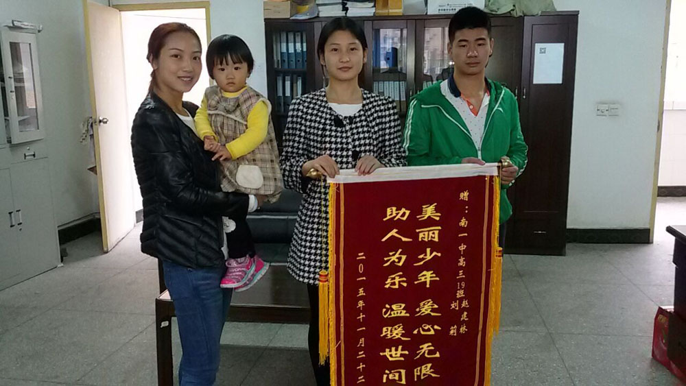 (朱興華)這個不到兩歲的小姑娘叫田媛,一個多月前和家人走散,獨自跑到馬路中央,被南溪一中高三19班的學(xué)生劉莉、趙建林發(fā)現(xiàn),帶到學(xué)校保衛(wèi)科后撥打了110報警,焦急的家長領(lǐng)到孩子后十分感謝這兩個學(xué)生,而兩個學(xué)生卻并沒有留下任何聯(lián)系方式。而小田媛的媽媽,卻一直記掛著此事,幾番周折終于在一個多月的今天找到了這兩位做好事不留名的“美麗少年”,為表謝意送上錦旗——美麗少年 愛心無限 助人為樂 溫暖世間 。(審簽:駱關(guān))