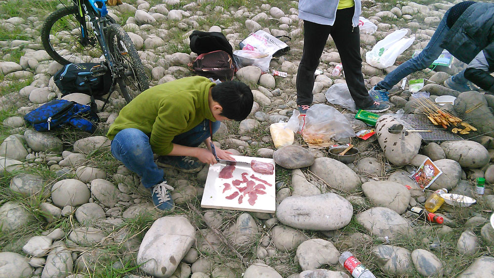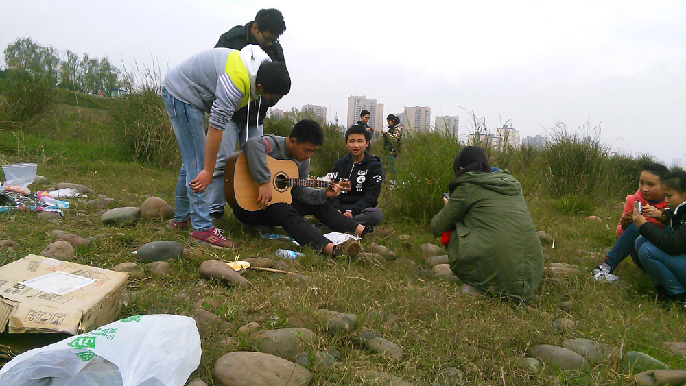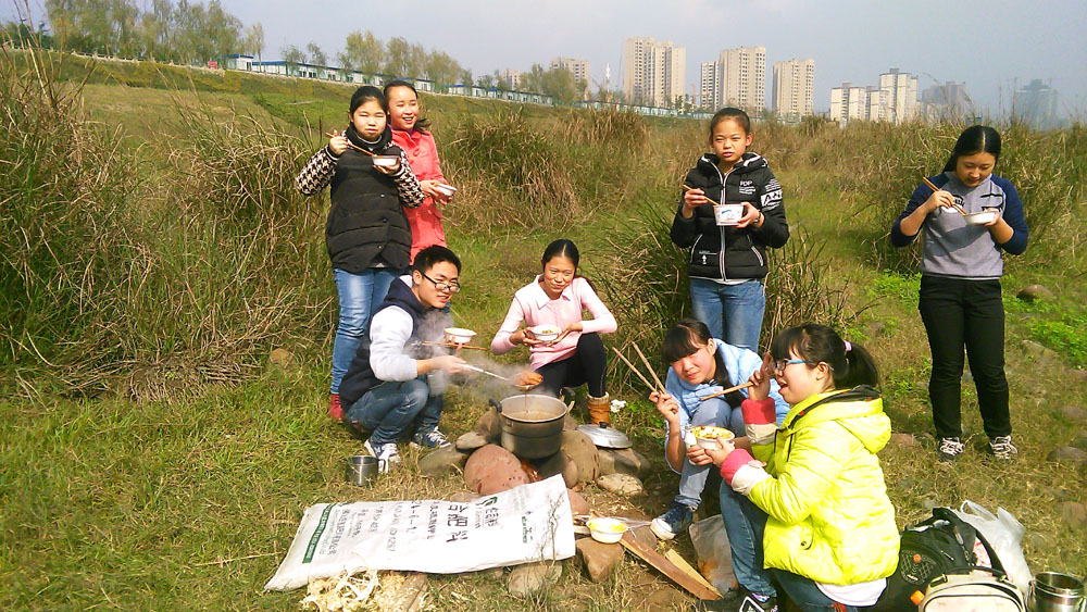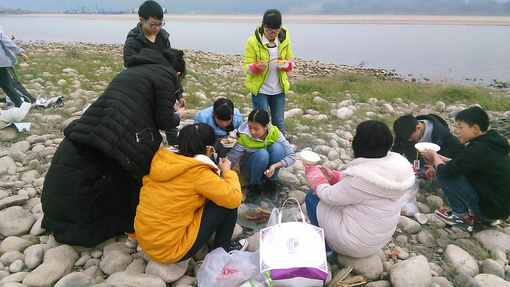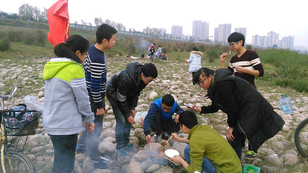 燒烤、火鍋等各種菜肴的制作不但考驗著同學們的生火技能,也考驗著他們的協(xié)作能力。在活動現(xiàn)場,除了野炊以外,同學們還在河畔做游戲、彈吉他、唱歌助興,一派熱鬧非凡的景象。
