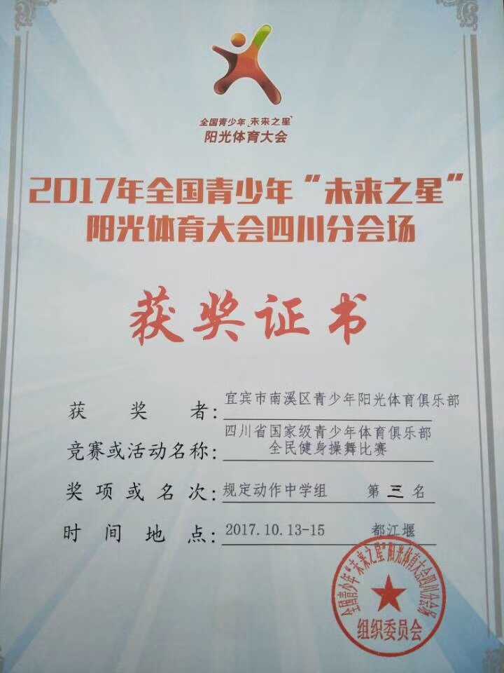(張濤)10月15日,由四川省體育局主辦,四川省青少年體育俱樂部聯(lián)合會、四川省健美操協(xié)會、成都市青少年體育俱樂部聯(lián)合會和都江堰市體育局承辦的“2017年全國青少年未來之星陽光體育大會四川分會場暨國家青少年全民健身操舞比賽”在都江堰市舉行。全省各地市州多個體育俱樂部組隊參加比賽,南溪一中健美操隊在規(guī)定動作中學(xué)組比賽中脫穎而出,獲得全省第三名。