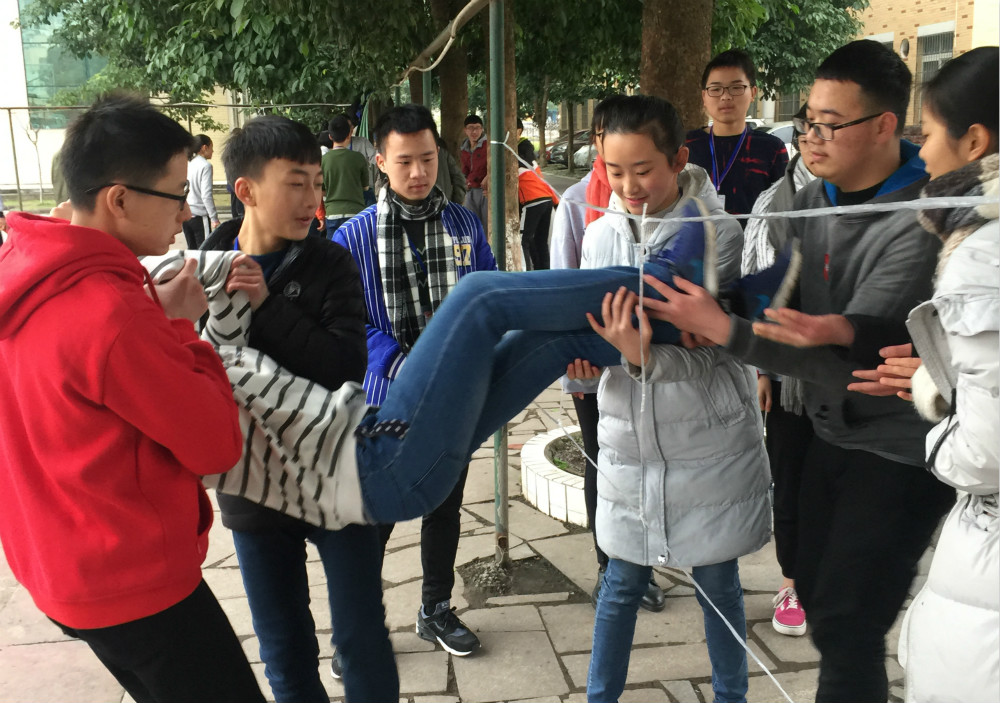 第二個活動是“穿越火線”,鍛煉隊員之間學會相互信任,用繩子代替火線,不觸碰并最先完成穿越即為獲勝。同學們都積極參與,熱情高漲,近兩個小時的團隊活動在歡笑聲中結束。