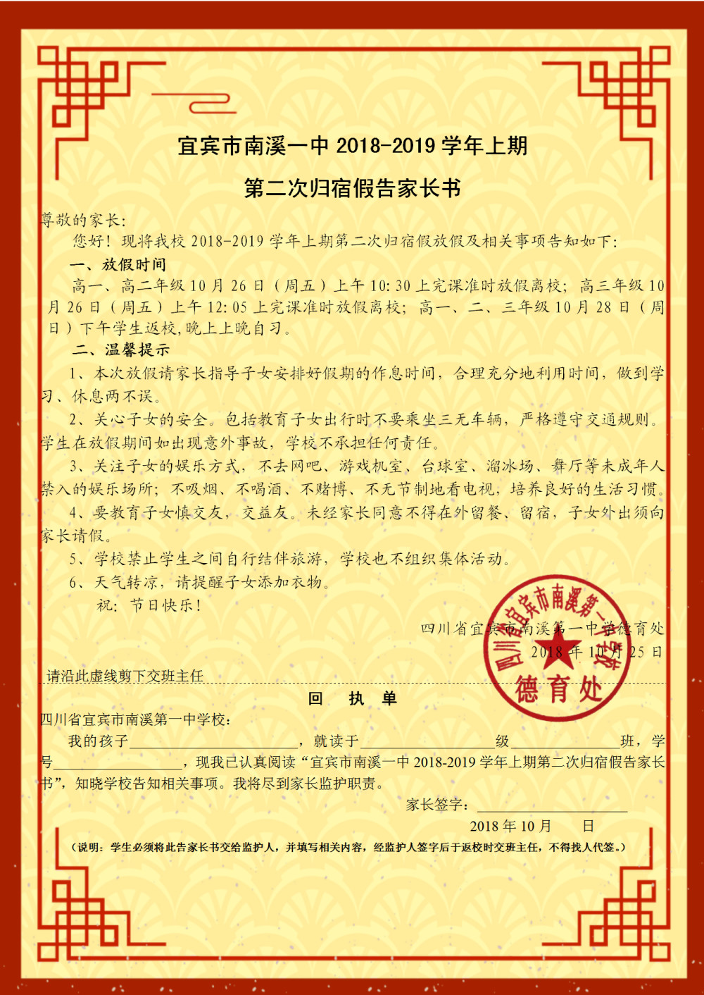宜賓市南溪一中2018-2019學(xué)年上期第二次歸宿假告家長書