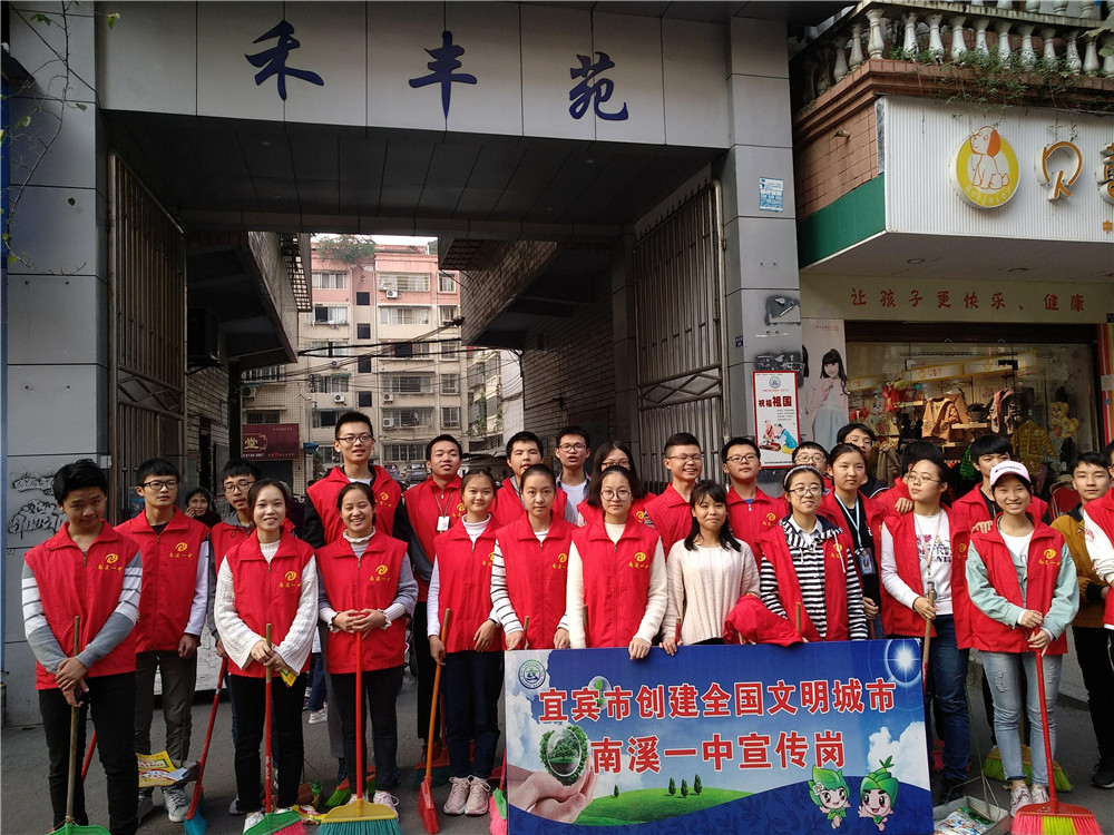 (王信釧 )為積極響應(yīng)宜賓市爭創(chuàng)全國文明城市號(hào)召,11月13日,南溪一中組織學(xué)生參加“創(chuàng)文”志愿者活動(dòng)。學(xué)生們到街道打掃衛(wèi)生、深入到社區(qū)參加義工勞動(dòng)、宣傳社會(huì)核心價(jià)值觀、宜賓精神、全國道德模范王家元、全國文明家庭熊永倫家庭先進(jìn)事跡。