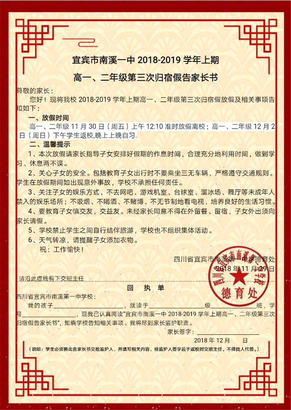 南溪一中2018-2019學(xué)年上期高一、二年級(jí)第三次歸宿假告家長(zhǎng)書(shū)