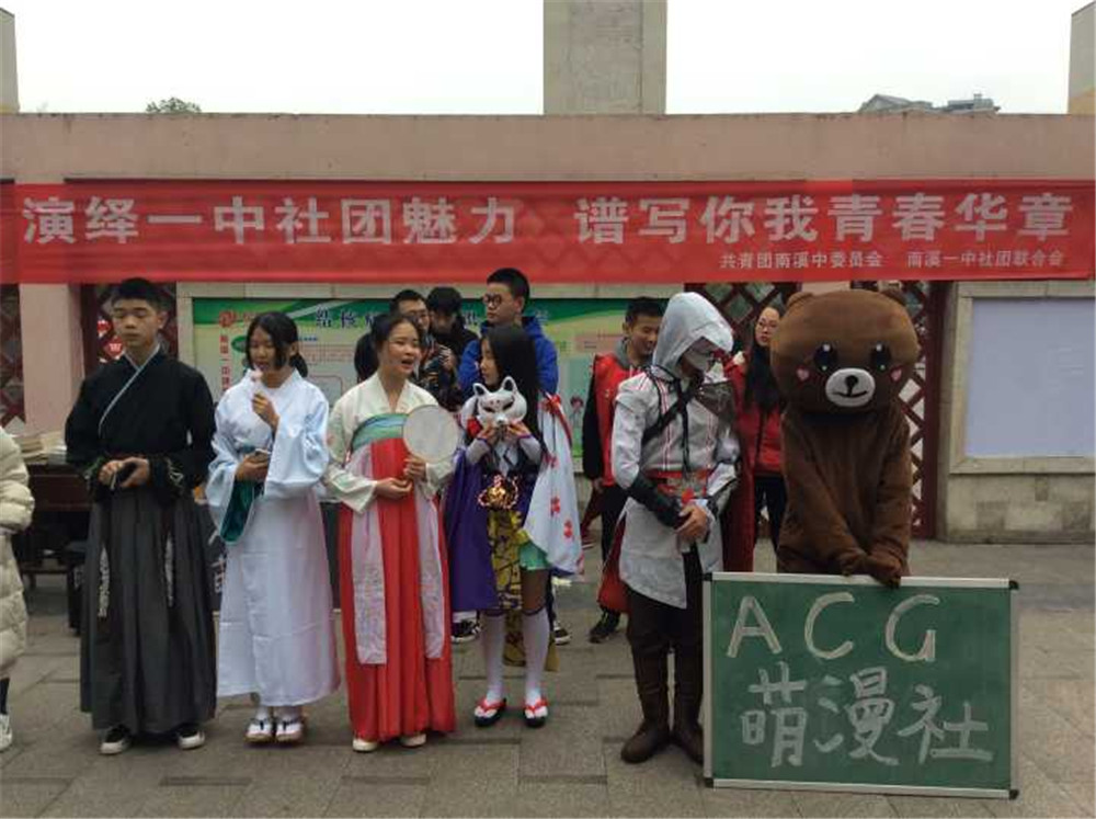 各個社團踴躍演出,其中ACG萌漫社展出豐富漫畫供高一二年級學(xué)生免費借閱以及派出數(shù)十名動漫角色扮演者在音樂廣場表演。