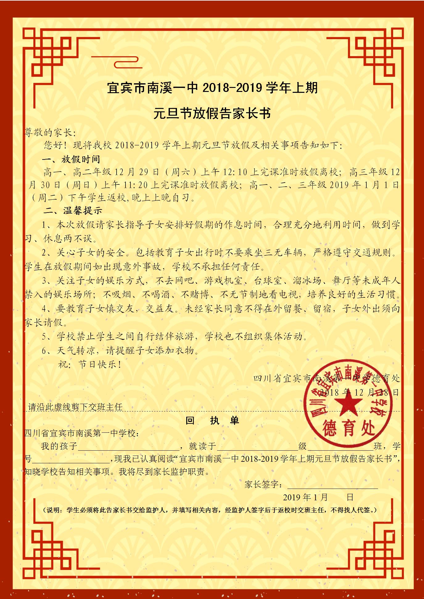 南溪一中2018-2019學(xué)年上期元旦節(jié)放假告家長(zhǎng)書(shū)