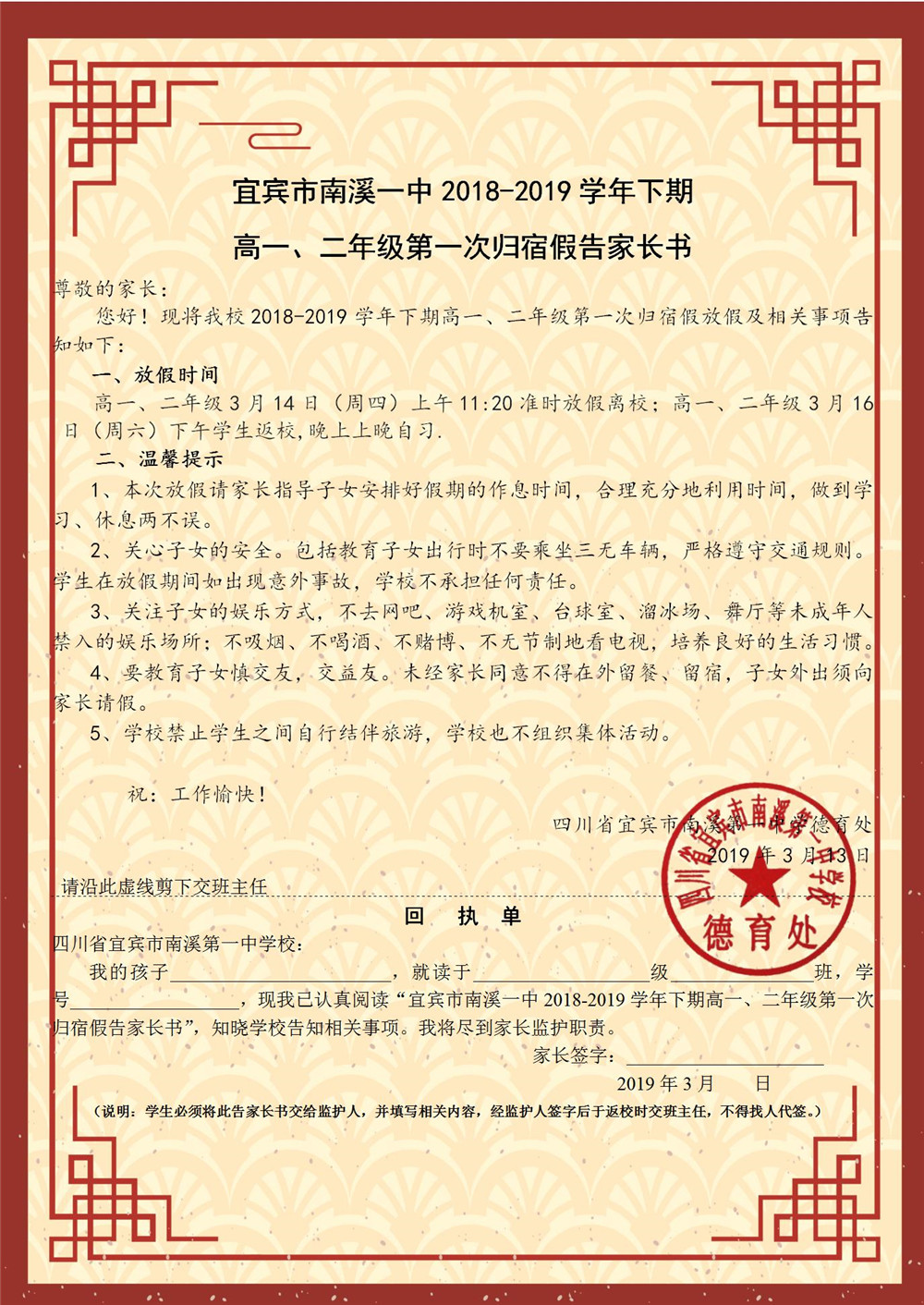 南溪一中2019年春期高一、二第一次歸宿家告家長書