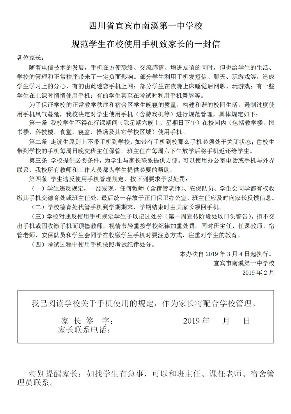 南溪一中規(guī)范學(xué)生在校使用手機(jī)致家長(zhǎng)的一封信