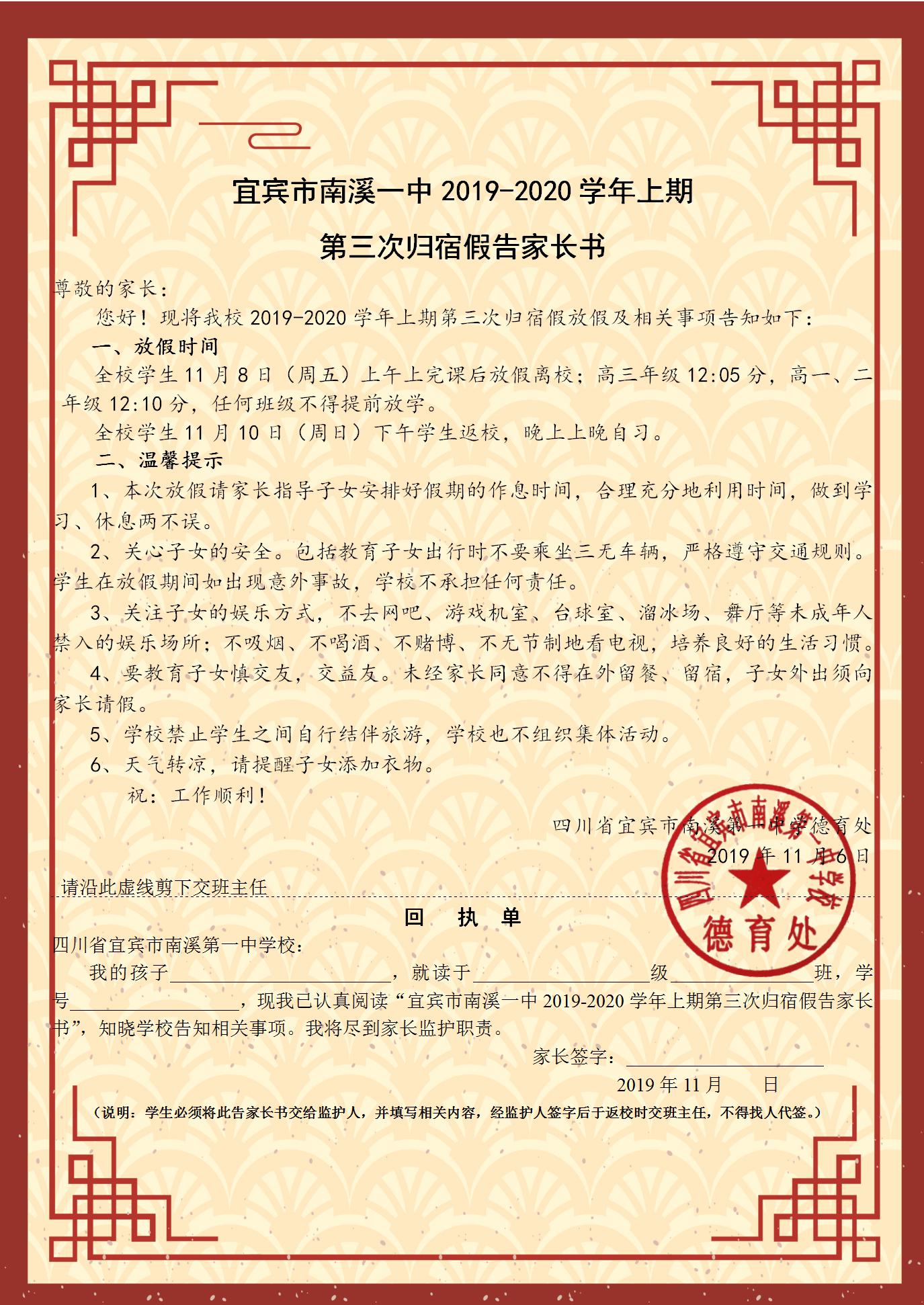 南溪一中2019-2020學(xué)年上期第三次歸宿假告家長(zhǎng)書