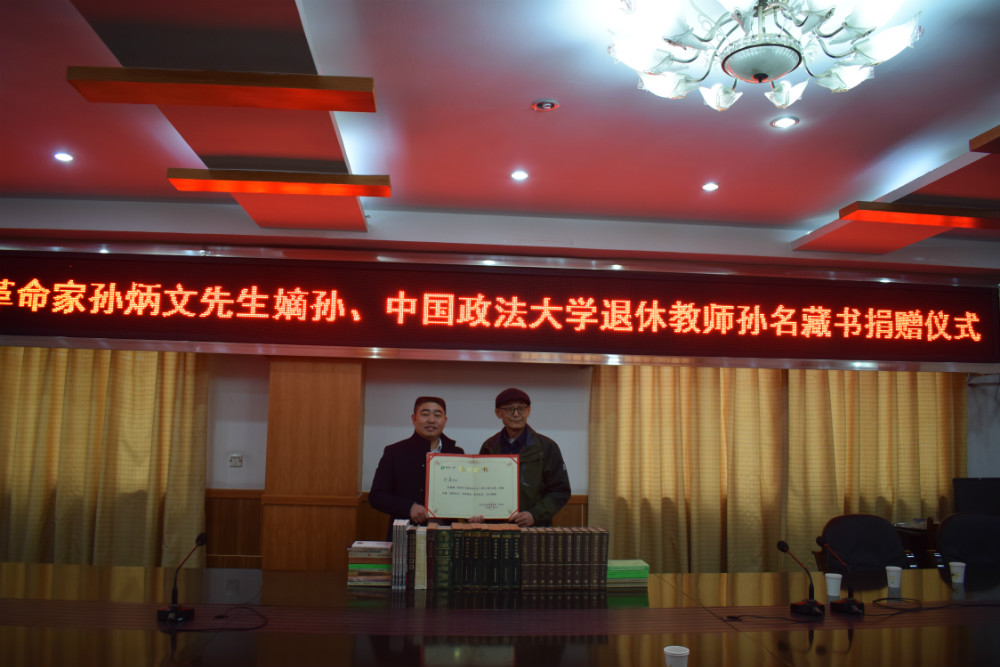 (杜洪興)11月19日,孫名先生贈書儀式在南溪一中行政樓三樓舉行。黨委書記、校長高正鑫向早期無產(chǎn)階級革命家孫炳文嫡孫、中國政法大學退休教書孫名先生頒發(fā)捐贈證書。