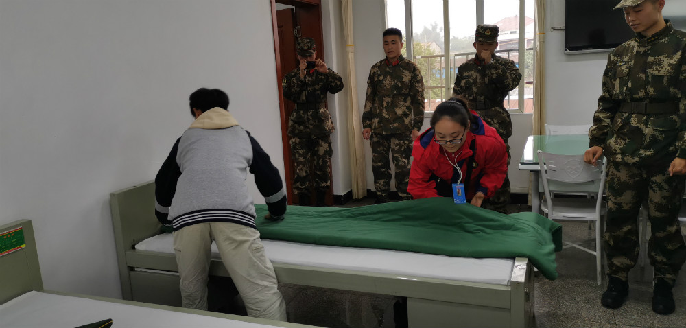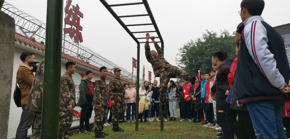 隨后,全體師生參觀了武警中隊內(nèi)務(wù)設(shè)置、宿舍、閱覽室等地。每一處都能感受到部隊紀(jì)律的嚴(yán)明和正直的風(fēng)氣。武警戰(zhàn)士還現(xiàn)場演示了內(nèi)務(wù)管理,利落的動作讓同學(xué)們不約而同地發(fā)出陣陣掌聲。同時,學(xué)生代表虛心向戰(zhàn)士請教了整理軍容、折疊軍被的方法。接下來,武警中隊?wèi)?zhàn)士在訓(xùn)練場實地為同學(xué)們演示了單雙桿練習(xí),規(guī)范的姿勢,挺拔的身軀讓學(xué)生贊嘆不已。
