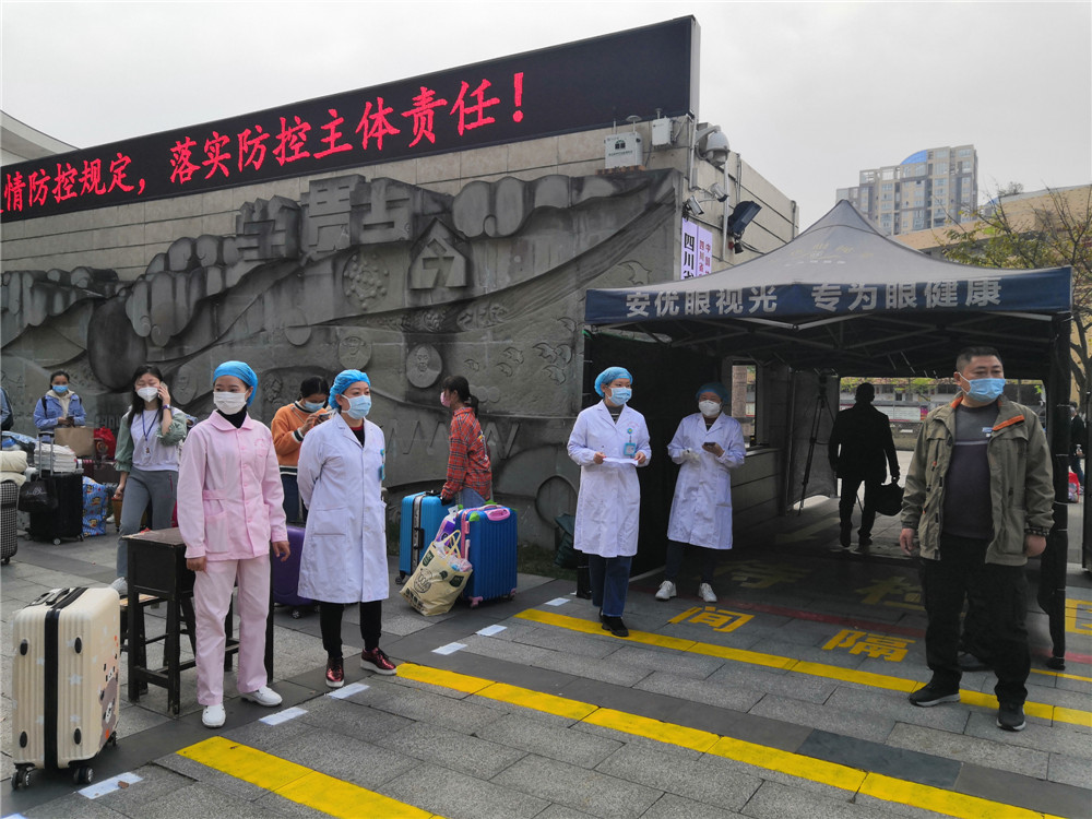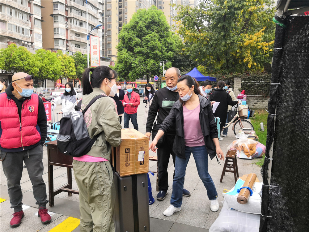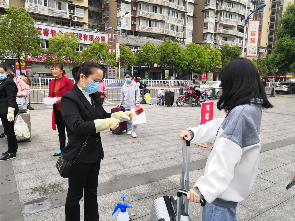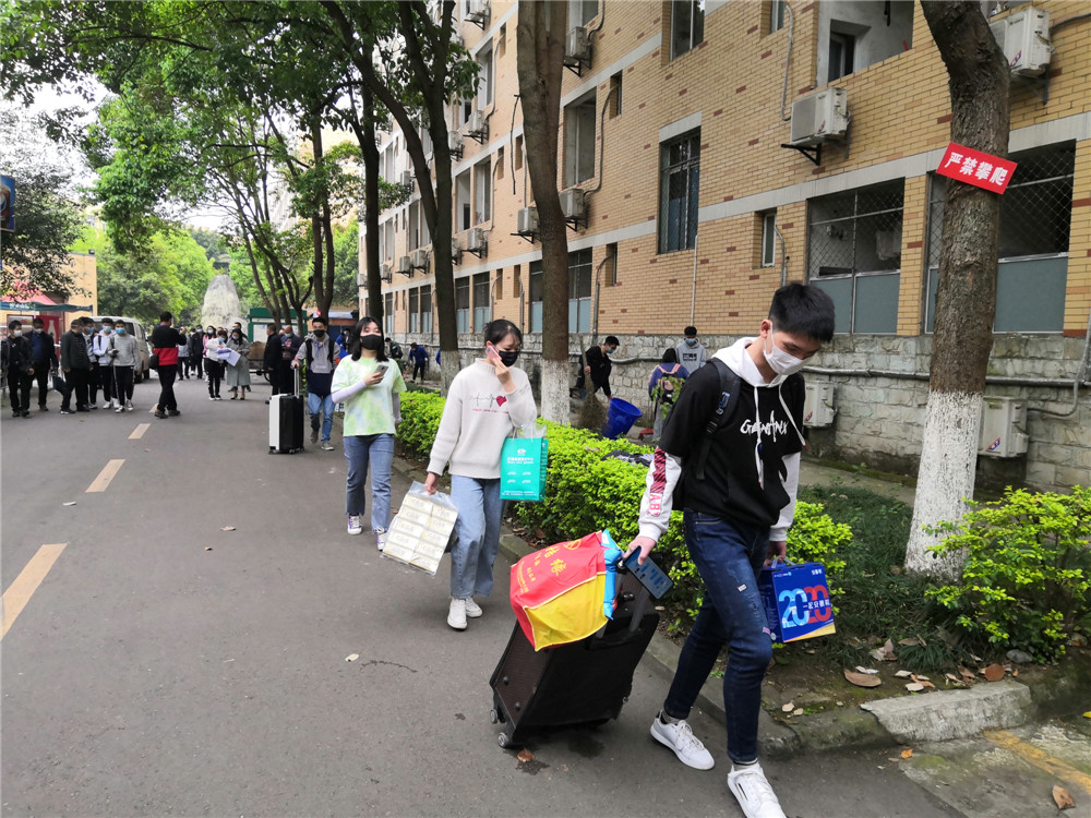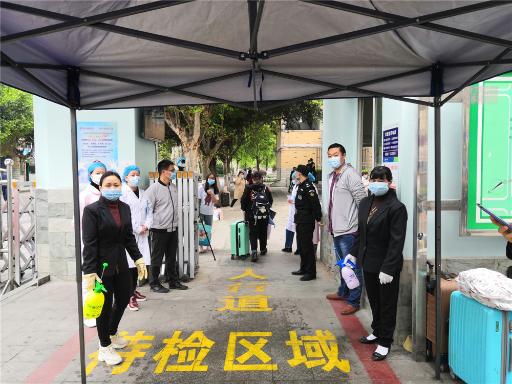 早上7時(shí)30分,南溪一中高三學(xué)生陸續(xù)來到學(xué)校。在學(xué)校入口處,學(xué)生們攜帶隨身物品進(jìn)入查驗(yàn)通道,進(jìn)行隨身物品消毒,并按照地上間隔1米的貼標(biāo)站位,并依次排隊(duì)經(jīng)過紅外線體溫檢查。同學(xué)們進(jìn)入校園后,宿管老師在宿舍門口還會(huì)為學(xué)生測體溫,并引導(dǎo)學(xué)生按指定路線回寢室。