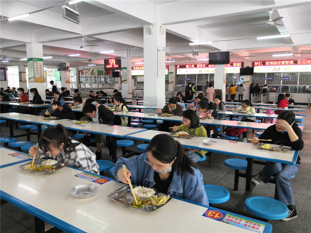 中午,已經(jīng)報(bào)到的學(xué)生在食堂就午餐前,間隔一米排隊(duì)用學(xué)校提供的肥皂洗手消毒,才可進(jìn)行就餐。同學(xué)們依次排隊(duì)就餐,秩序井然,無交頭接耳,規(guī)范就餐。