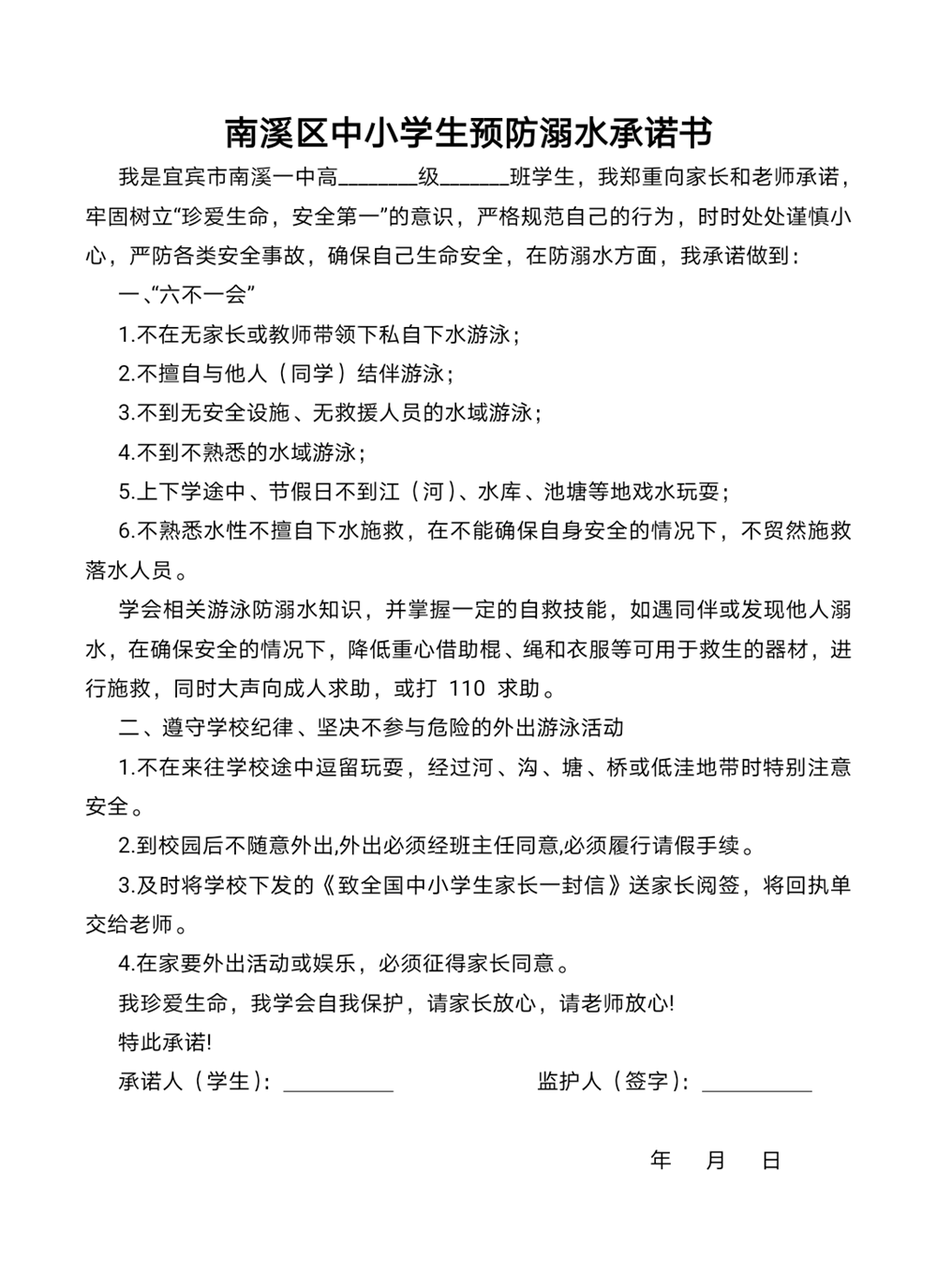 南溪區(qū)中小學(xué)生預(yù)防溺水承諾書