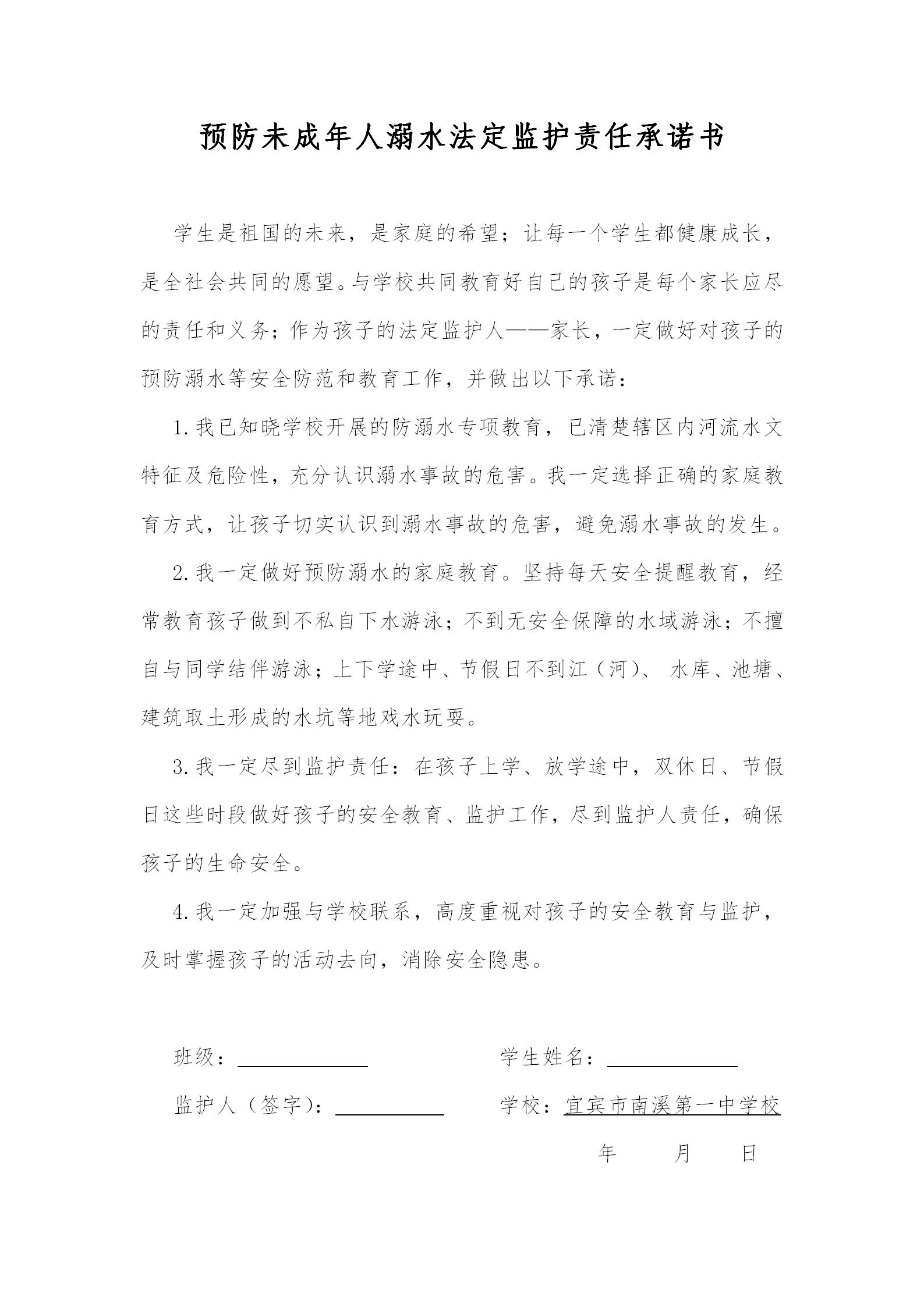 預(yù)防未成年人溺水法定監(jiān)護責(zé)任承諾書