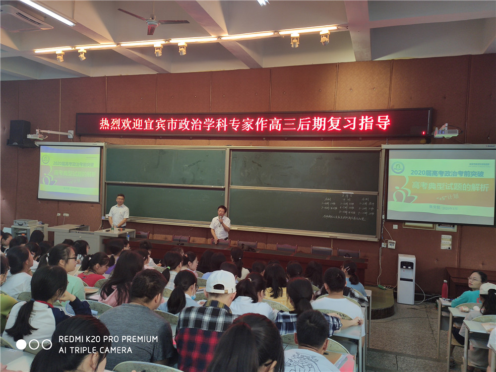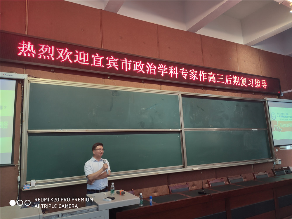(曾丞君)5月30日,宜賓市教科所副所長、政治教研員張安權(quán)放棄周末休息時(shí)間來到南溪一中,為高三文科學(xué)生作了題為《2020屆高考政治考考前突破--高考典型試題的解析》的講座,高三階梯教室座無虛席。