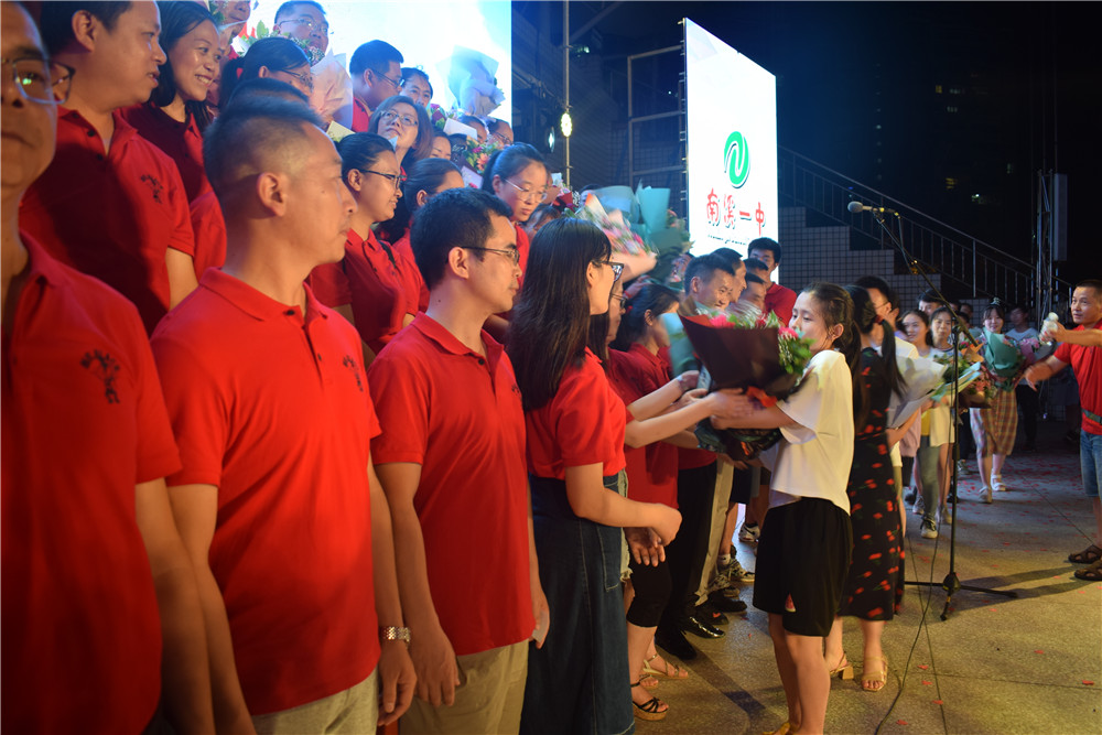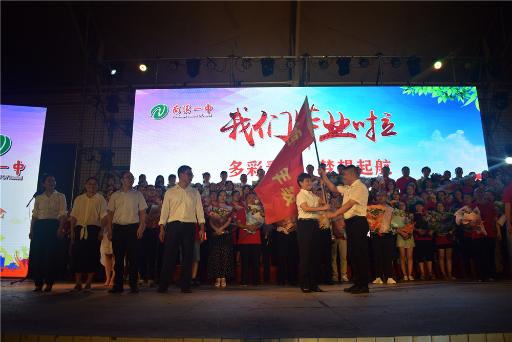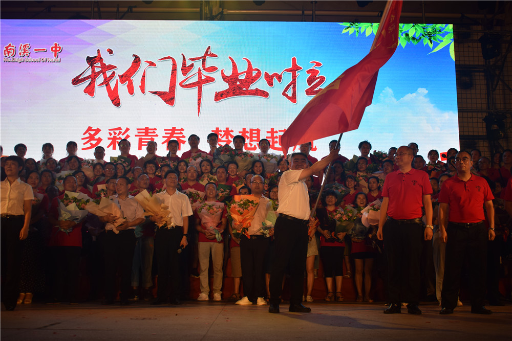 畢業(yè)典禮開展了“青春奔跑,感恩有您”現(xiàn)場活動,與會學(xué)子踴躍表達(dá)了自己對辛苦付出和陪伴自己成長老師們表達(dá)了深深的謝意和美好的祝福。高三教師翻唱的《野狼disco》讓整個(gè)畢業(yè)典禮走向了高潮。高三全體教師《圓夢一中,飛向未來》的精彩朗讀,細(xì)細(xì)回顧了三年師生情和表達(dá)對莘莘學(xué)子的美好祝愿。隨后舉行了“奮斗大旗,接力交接儀式”,高正鑫校長從將高三旗幟交到高2018級新高三手中,勉勵(lì)新高三接續(xù)奮斗,譜寫新的華章。