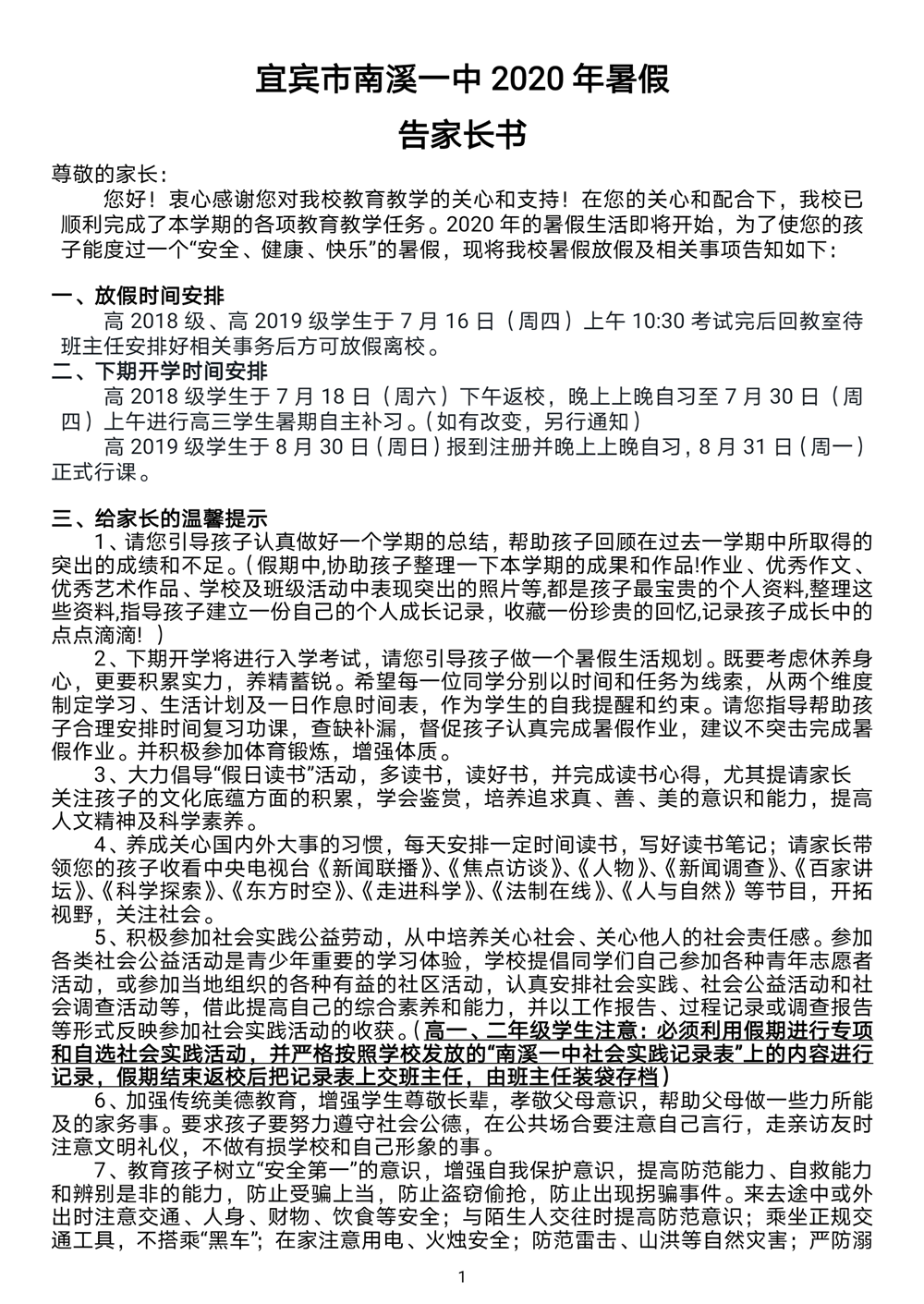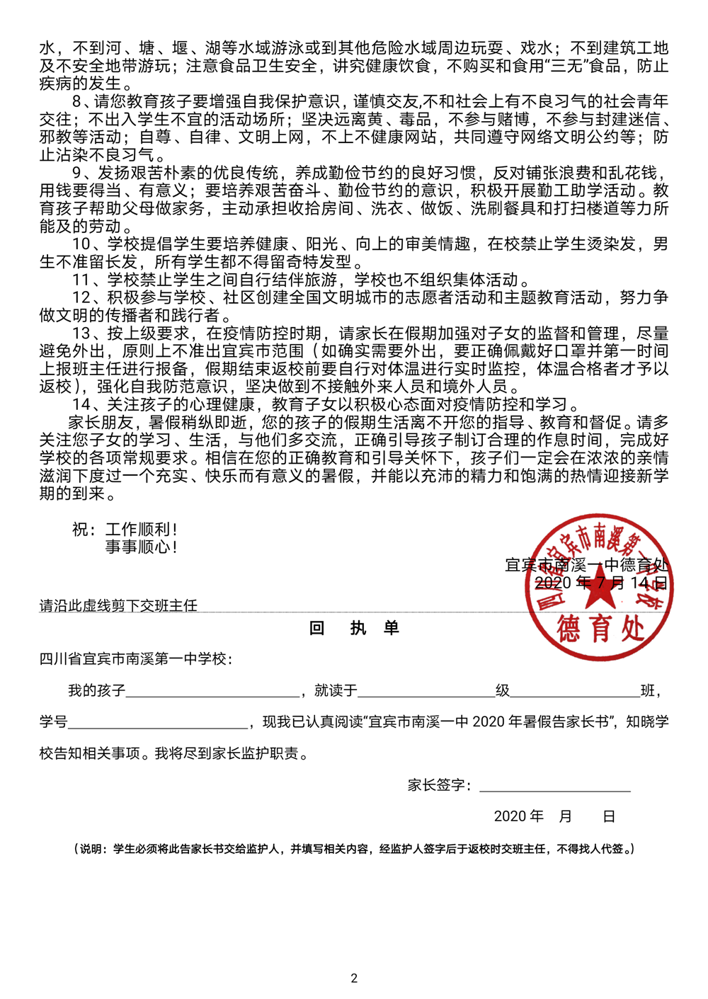 南溪一中2020年暑假告家長書