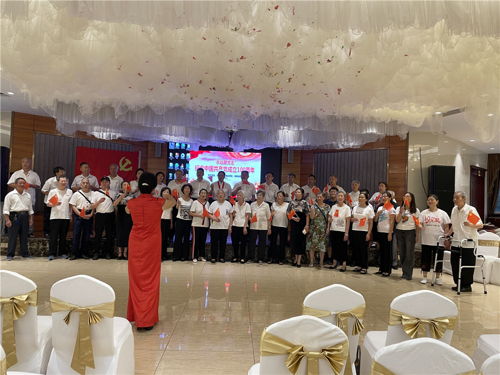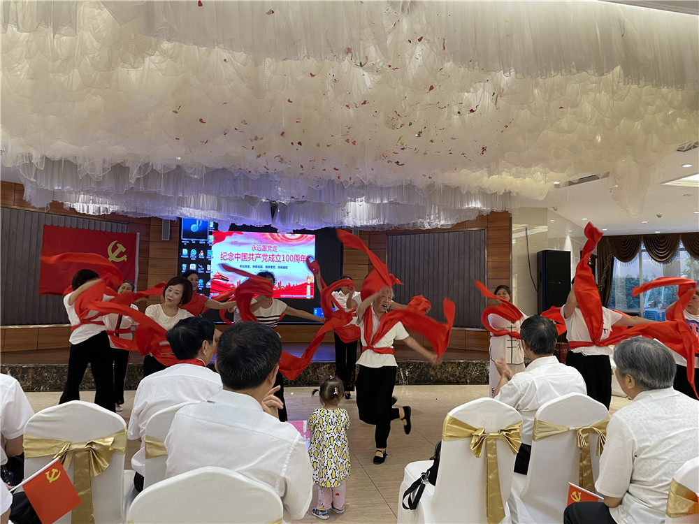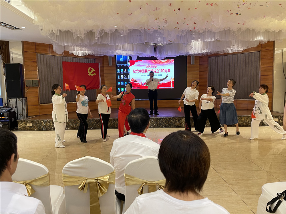 活動中,退休黨員同志們熱情洋溢、激情澎湃地合唱了《沒有共產(chǎn)黨就沒有新中國》、《我的祖國》等經(jīng)典紅歌,表達(dá)對黨的熱愛和美好祝福,一首一首紅色經(jīng)典曲目唱出了堅(jiān)定跟黨走的信念,激發(fā)了大家愛黨愛國的熱情,大家紛紛通過詩朗誦、舞蹈、扭秧歌等一系列活動展現(xiàn)了對建黨100周年的喜悅之情。