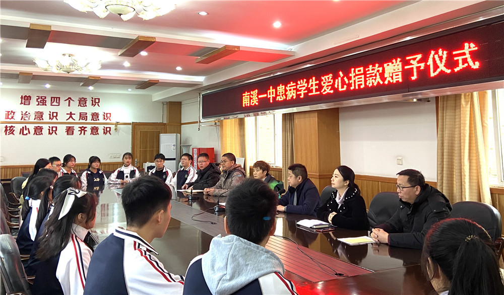 (肖璐璐)11月25日,南溪一中在勤政樓會議室為高2020級8班聶宏宇同學舉行了愛心捐款贈予儀式。學校黨委委員、副校長張華珍,德育處和團委相關老師,聶宏宇同學班主任及家長等參加。