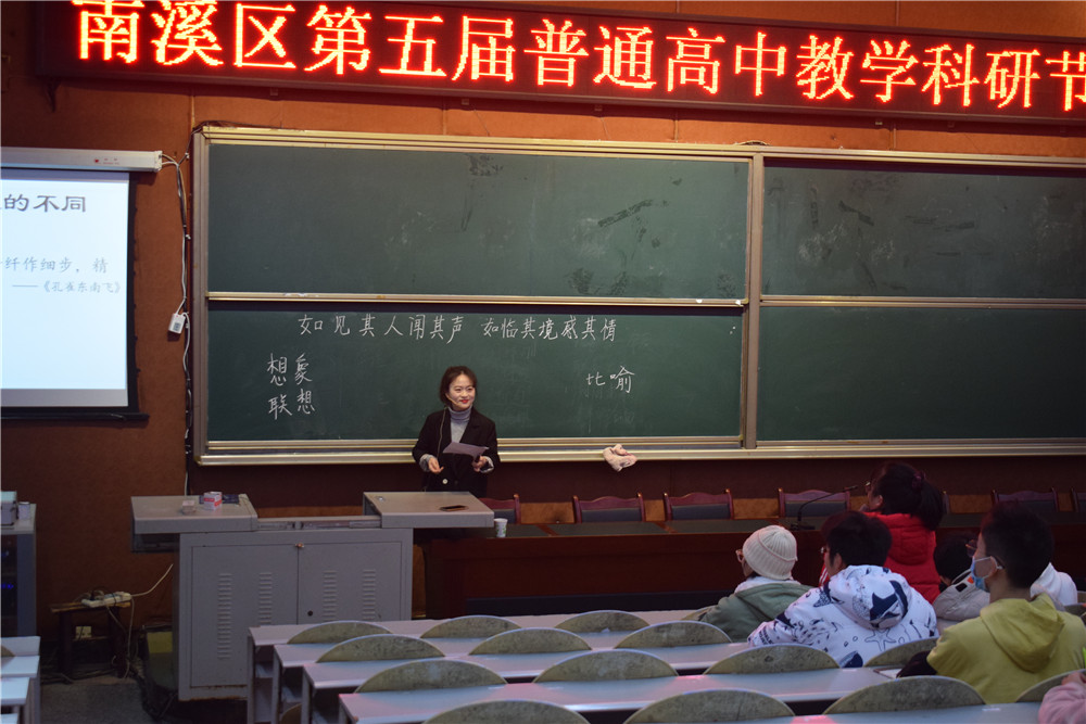 南溪一中語文教師張馨的《如見其人聞其聲,如臨其境感其情——作文形象化思維訓練》更是把學生帶入到作文教學中。張馨老師基本功扎實,教態(tài)大方、親切、富有親和力。一上課,以幽默生動的語言將學生帶入情境,通過比較鑒賞文段,思考不同的表達效果,從而得出可以通過比一比、換一換、添一添的方式進行文段創(chuàng)作,在回味課文經(jīng)典片段的同時結(jié)合學生表演,極大地提高了學生的學習積極性。隨后,通過小組討論修改文段以及以“存在我記憶詩篇里的那個人”為話題進行寫作,整堂課一氣呵成,妙趣橫生。