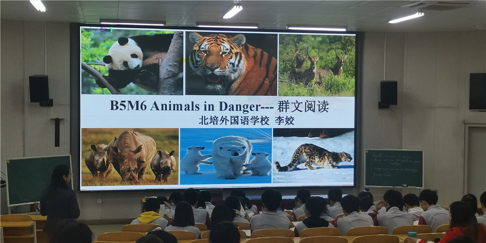 隨后,由北培外國語學(xué)校李姣老師帶來的《Book5 Module6 Animals in danger 群文閱讀》。她用直觀形象的視頻導(dǎo)入教學(xué)法引出今天的主題,課堂中李姣老師分小組進行閱讀教學(xué),分段落進行講解,一點一點滲透這堂課的閱讀分析技巧,同時向?qū)W生們進行了思維品質(zhì)的教育,呼吁大家保護動物,保護我們共同的家園。學(xué)生們都積極參與和配合李老師的課堂,紛紛踴躍發(fā)言。