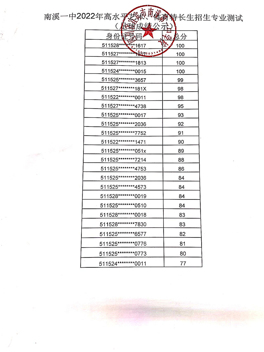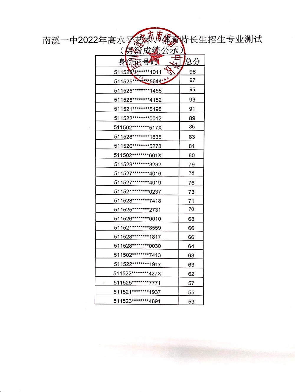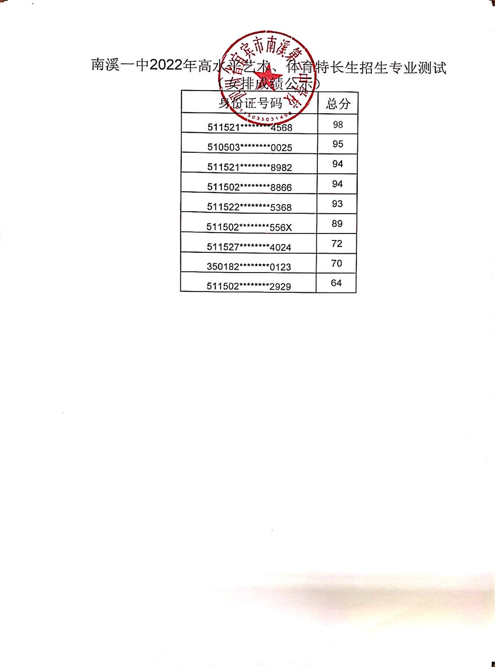 根據(jù)市、區(qū)教體局招生工作文件精神,按照南溪一中2022年高水平藝術(shù)、體育特長生招生簡章及方案,我校于2022年4月23日組織了藝術(shù)、體育特長生招生專業(yè)考試,現(xiàn)將成績予以公示。