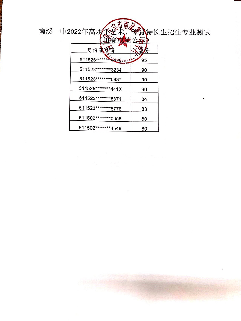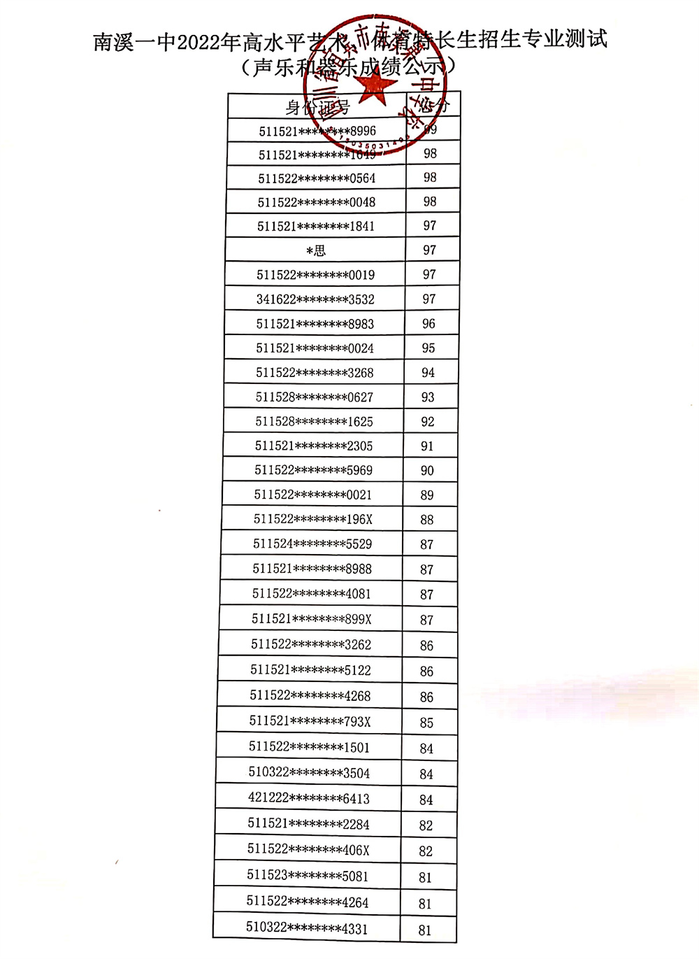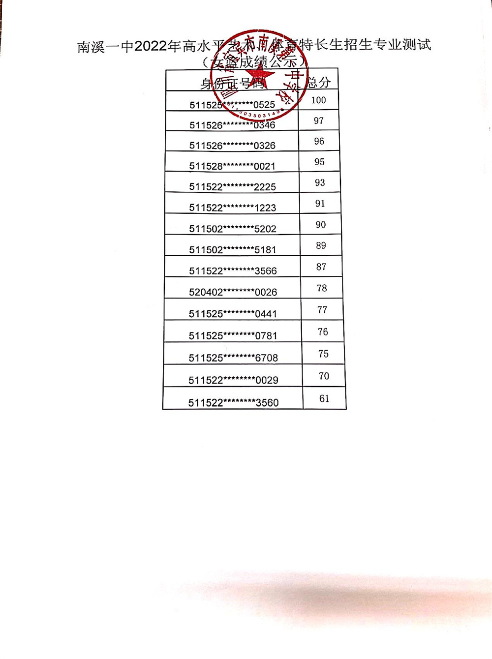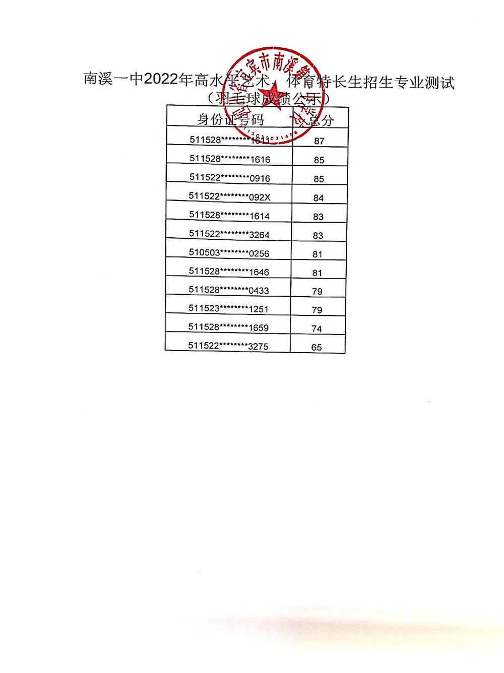 根據(jù)市、區(qū)教體局招生工作文件精神,按照南溪一中2022年高水平藝術(shù)、體育特長生招生簡章及方案,我校于2022年4月23日組織了藝術(shù)、體育特長生招生專業(yè)考試,現(xiàn)將成績予以公示。