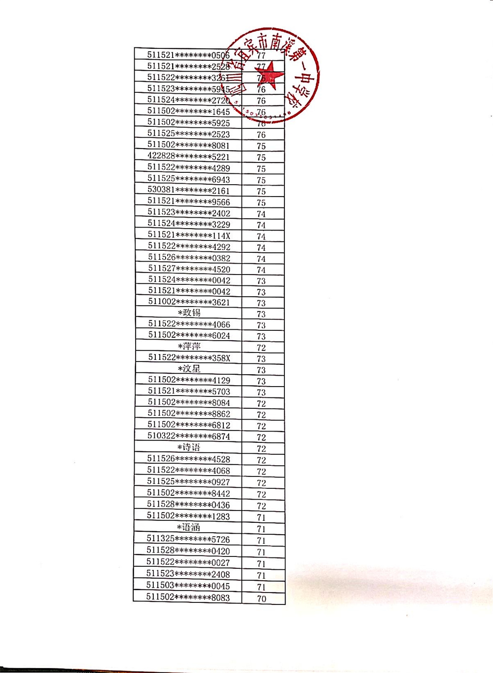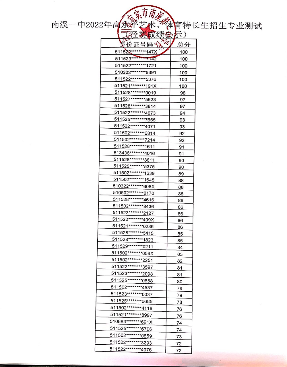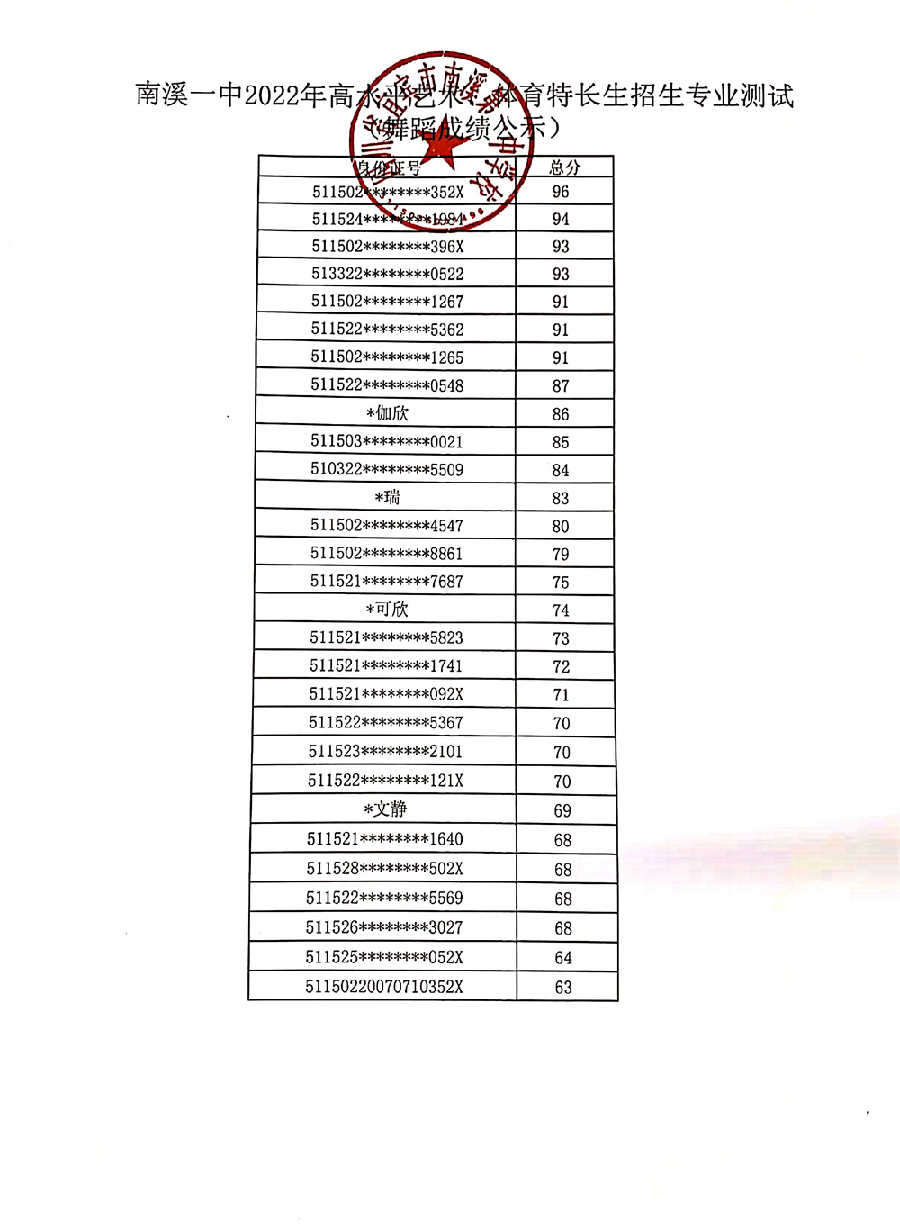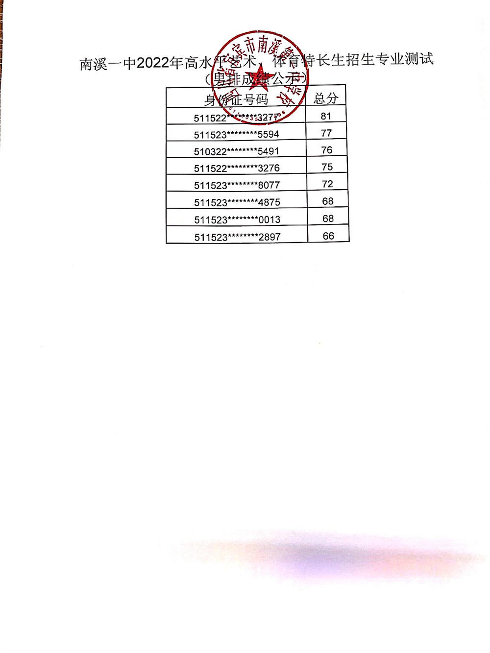南溪一中2022年高水平藝術(shù)、體育特長生招生專業(yè)測試成績公示