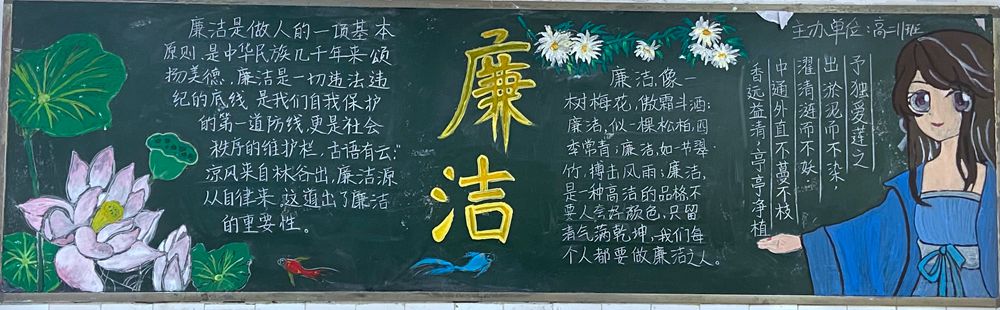 (肖璐璐)為堅(jiān)決貫徹習(xí)總書記來川來宜視察關(guān)于敬仰中華優(yōu)秀傳統(tǒng)文化、堅(jiān)定文化自信、注重家庭家教家風(fēng)建設(shè)等重要指示精神,積極營造崇廉尚潔的良好氛圍,進(jìn)一步增強(qiáng)師生的廉潔意識(shí),南溪一中于9月1日面向高二、高三年級(jí)開展了以“清風(fēng)潤校園,廉潔入我心”為主題的黑板報(bào)、手抄報(bào)比賽,經(jīng)過校紀(jì)委和德育處老師的精心組織和指導(dǎo),各班積極響應(yīng),高質(zhì)量地完成了此次主題板報(bào)展示活動(dòng),涌現(xiàn)出了一大批優(yōu)秀的作品。