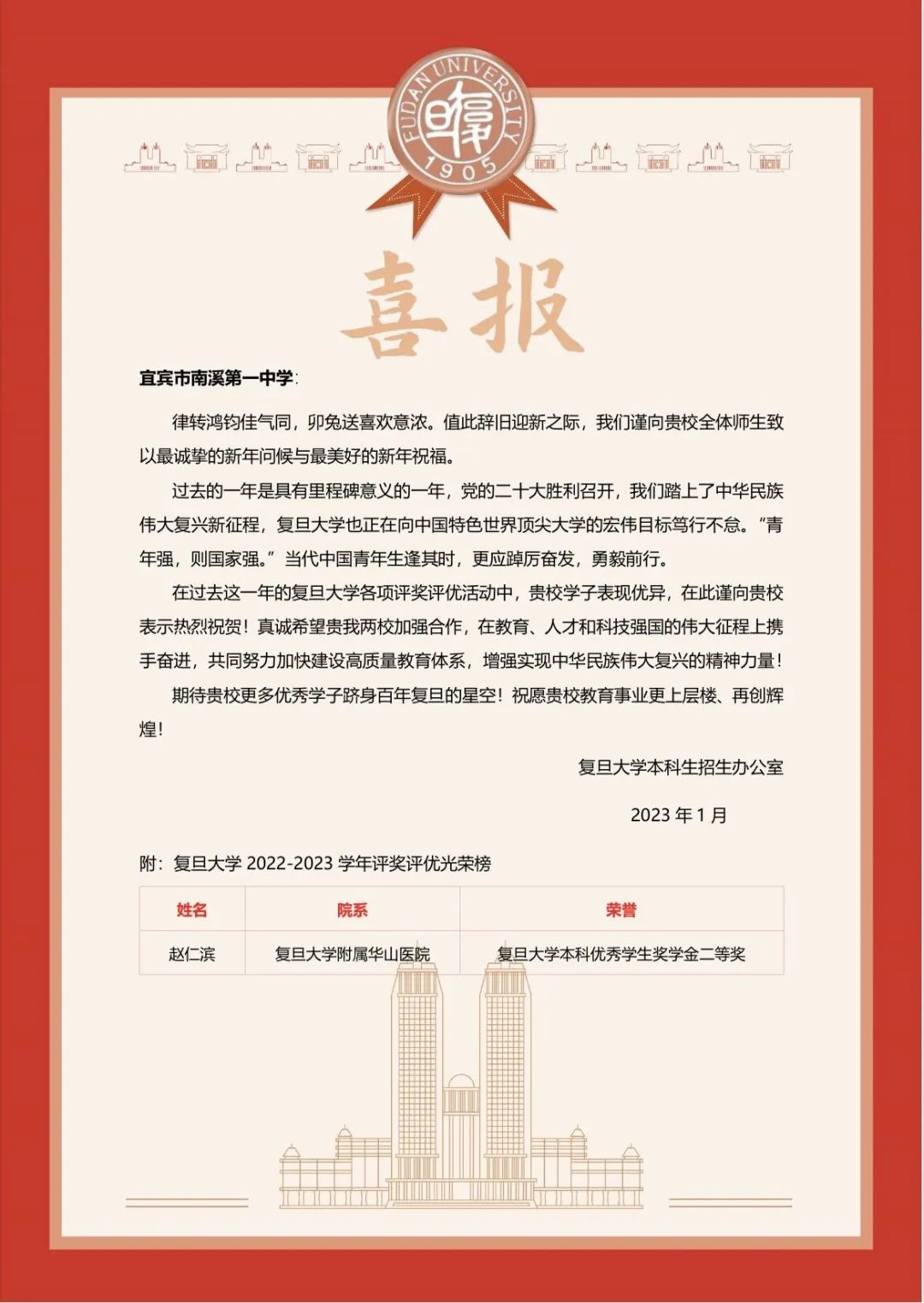 (曾薪蓉)新年伊始,南溪一中收到了來(lái)自復(fù)旦大學(xué)的喜報(bào),祝賀南溪一中升入復(fù)旦的學(xué)子趙仁濱在評(píng)優(yōu)評(píng)獎(jiǎng)中獲得了優(yōu)異成績(jī),充分展現(xiàn)了南溪一中學(xué)子突出的綜合素質(zhì)和巨大的發(fā)展?jié)摿Α?/SPAN>