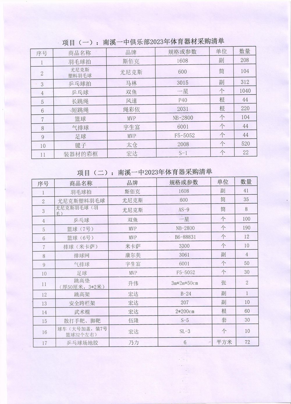 2.項目(二):南溪一中2023年體育器采購清單。