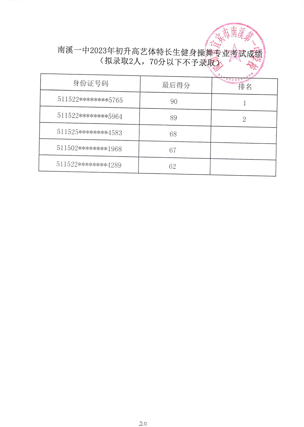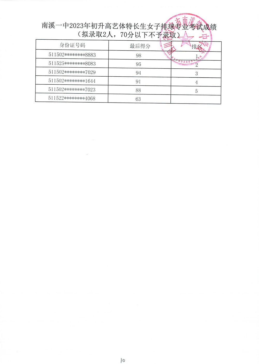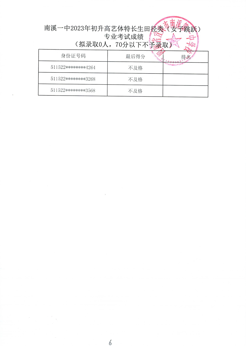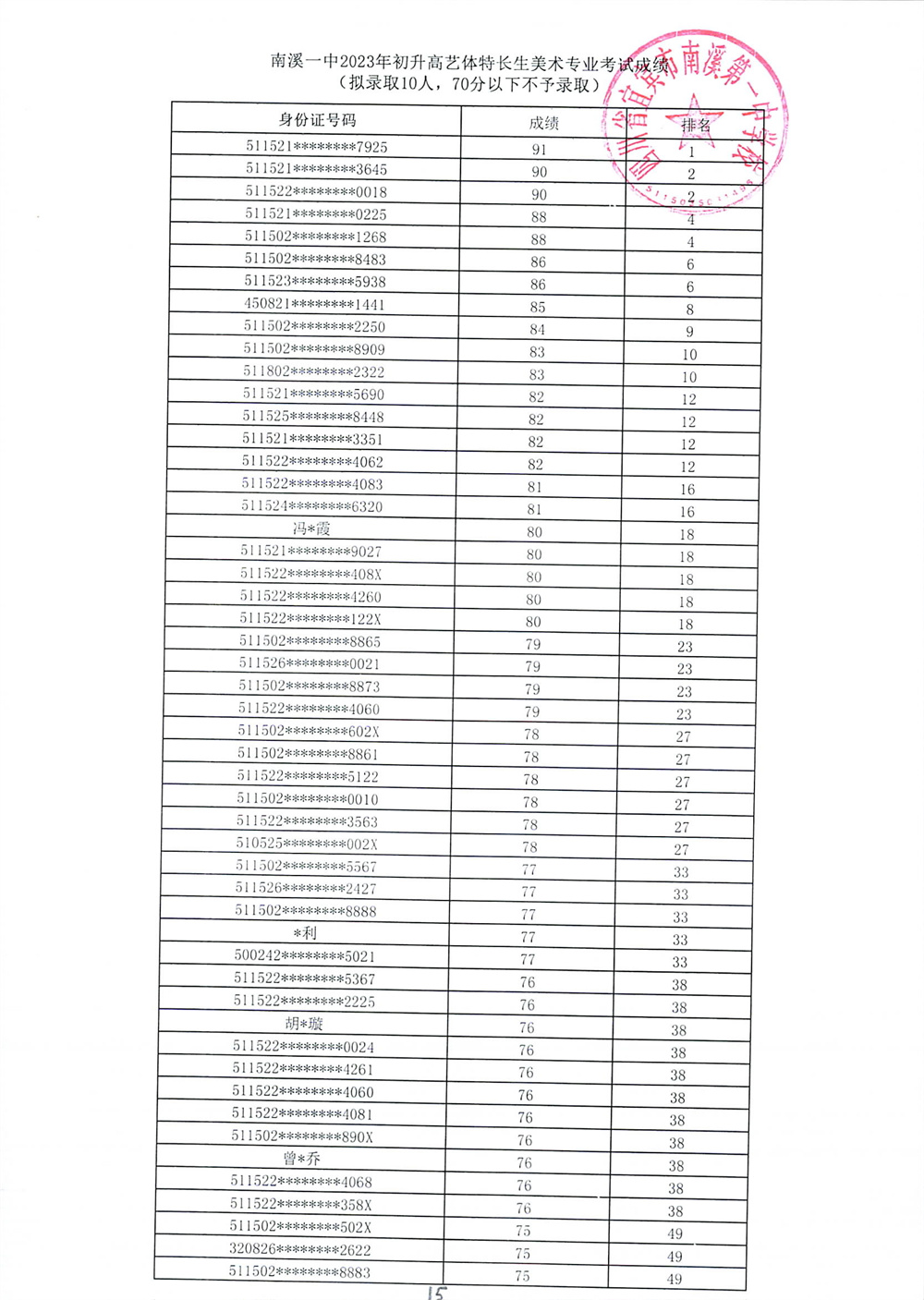 南溪一中2023年初升高藝體特長生招生專業(yè)考試成績公示