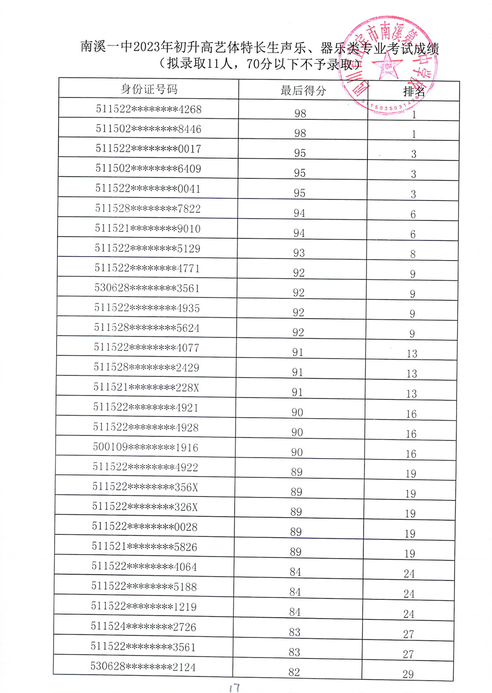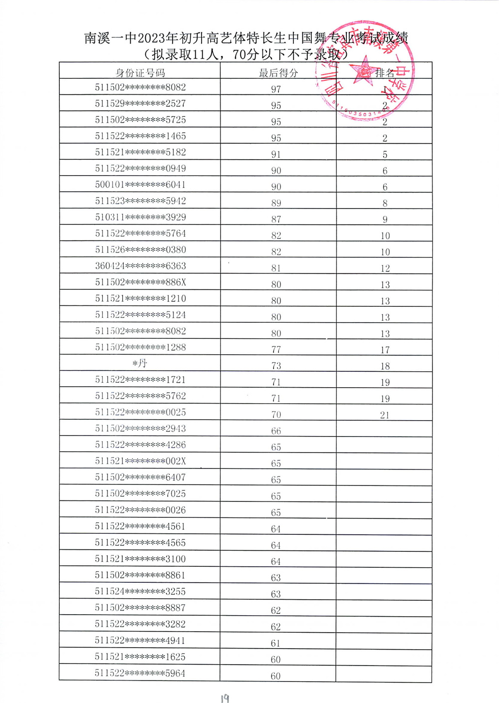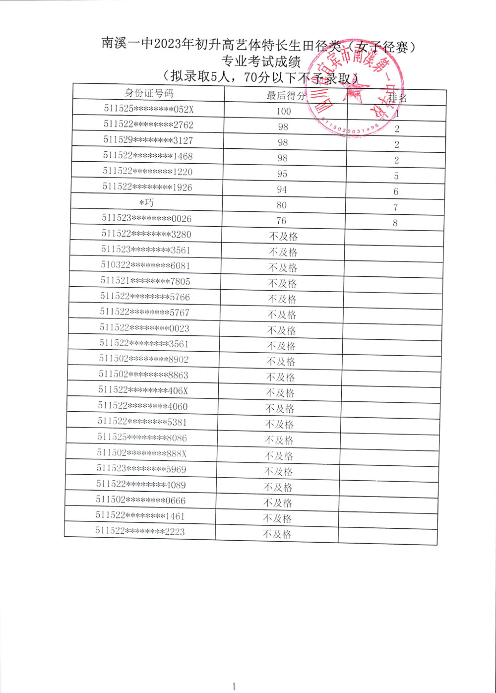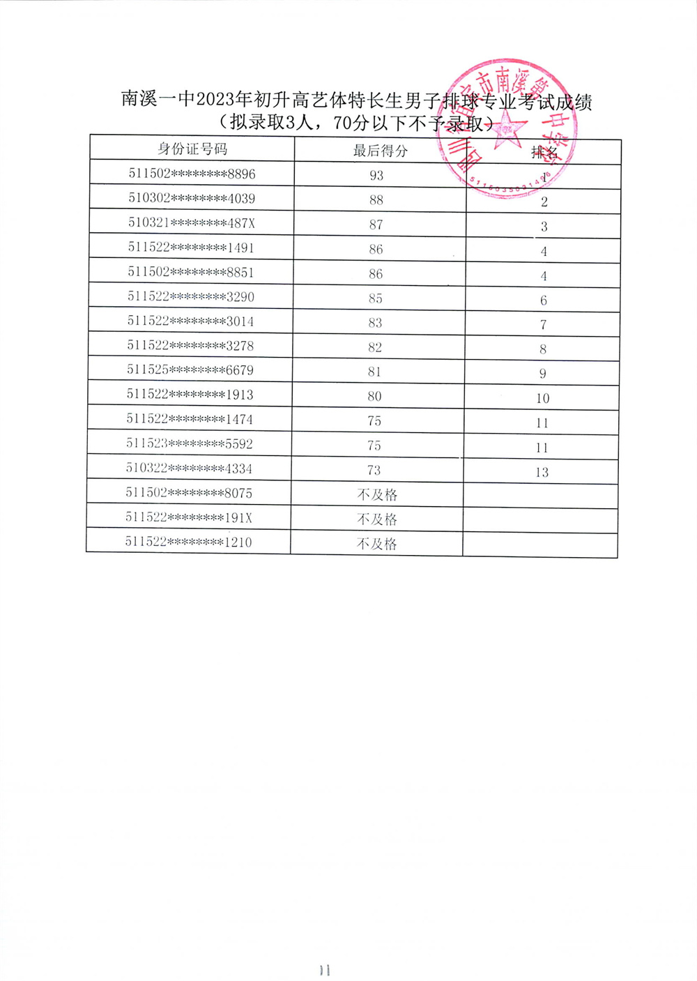 南溪一中2023年初升高藝體特長生招生專業(yè)考試成績公示