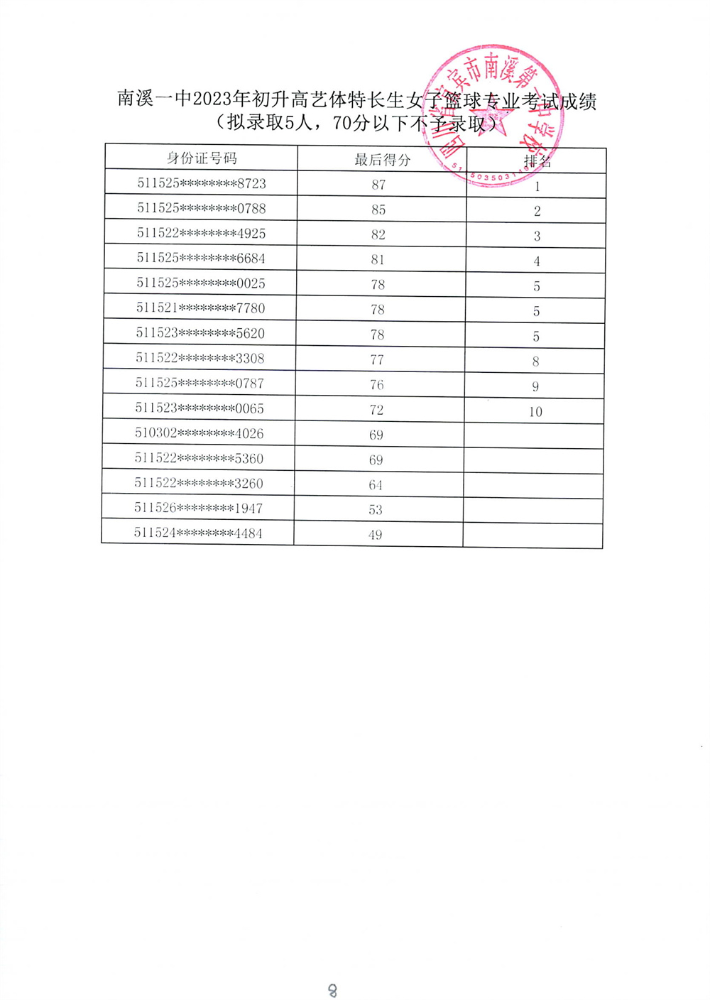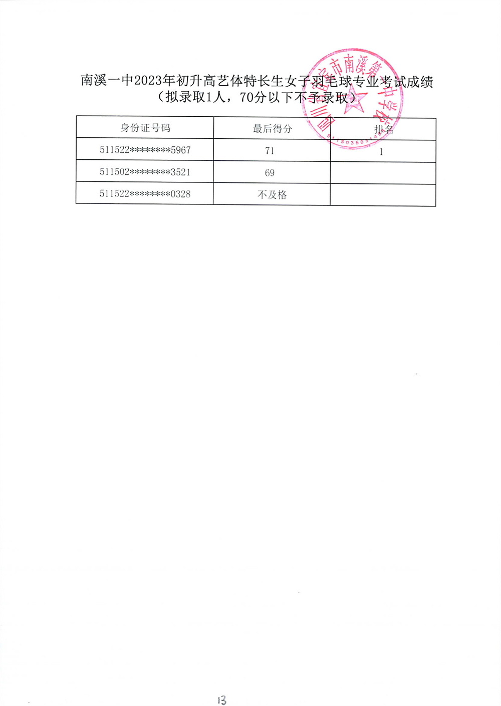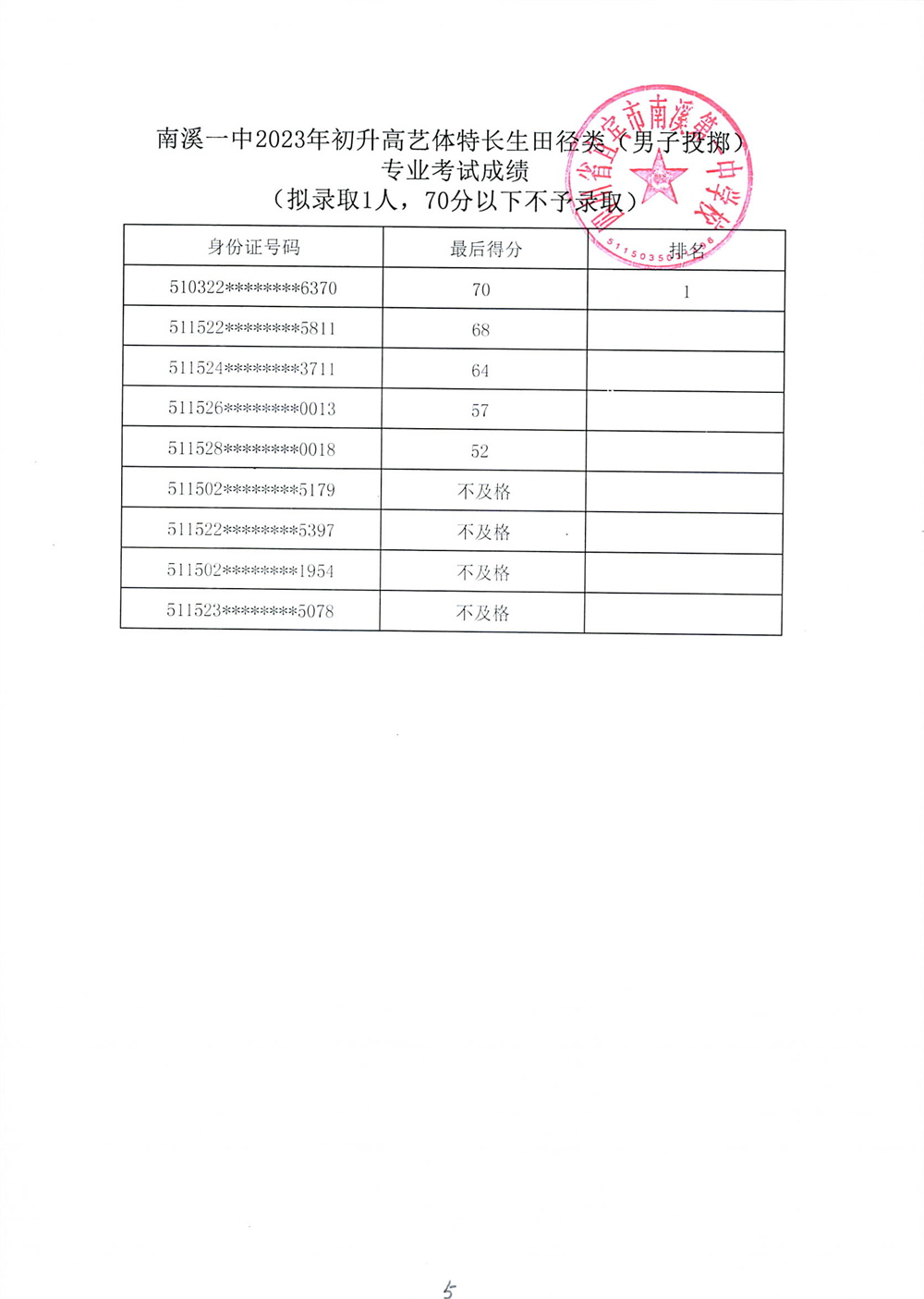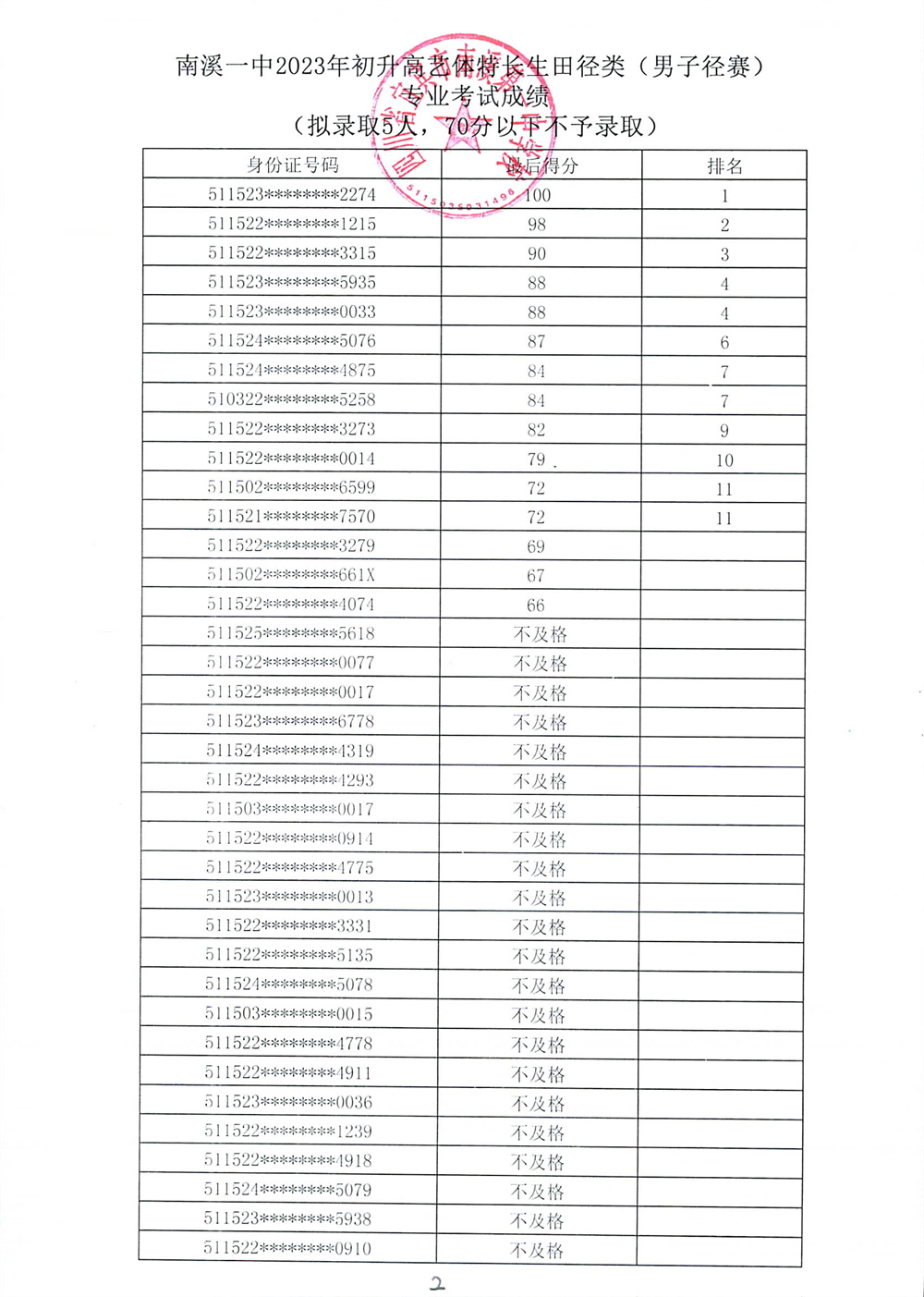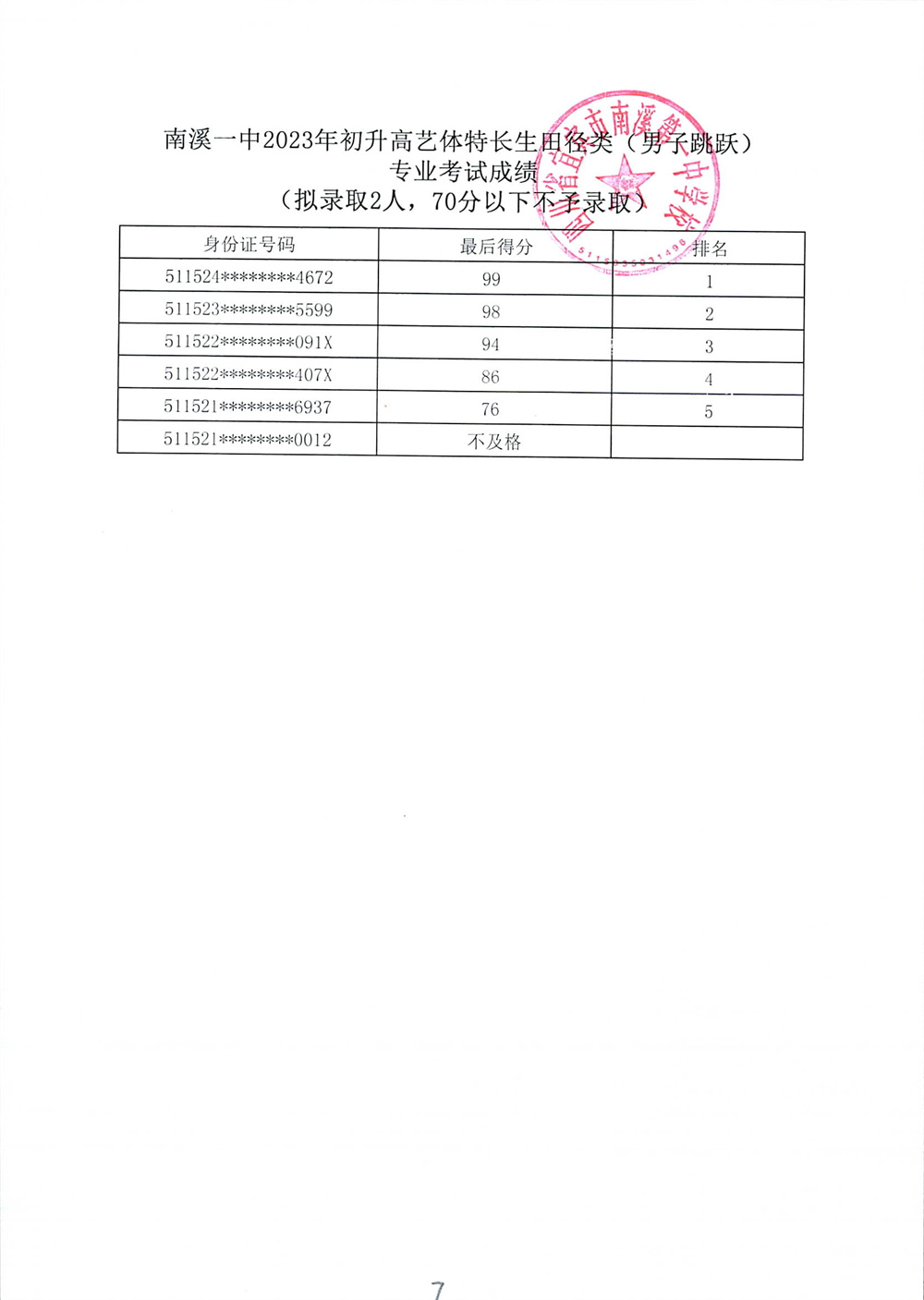 南溪一中2023年初升高藝體特長生招生專業(yè)考試成績公示
