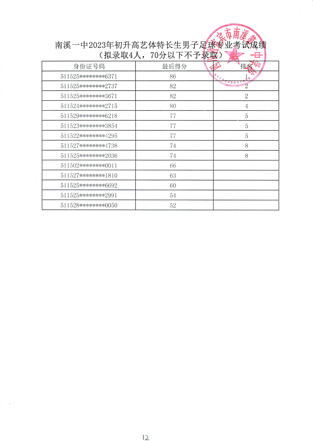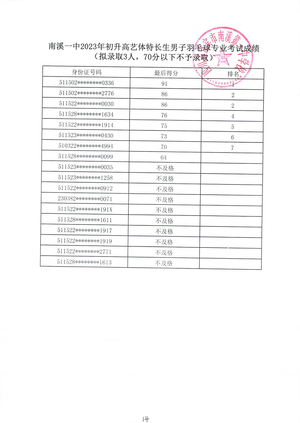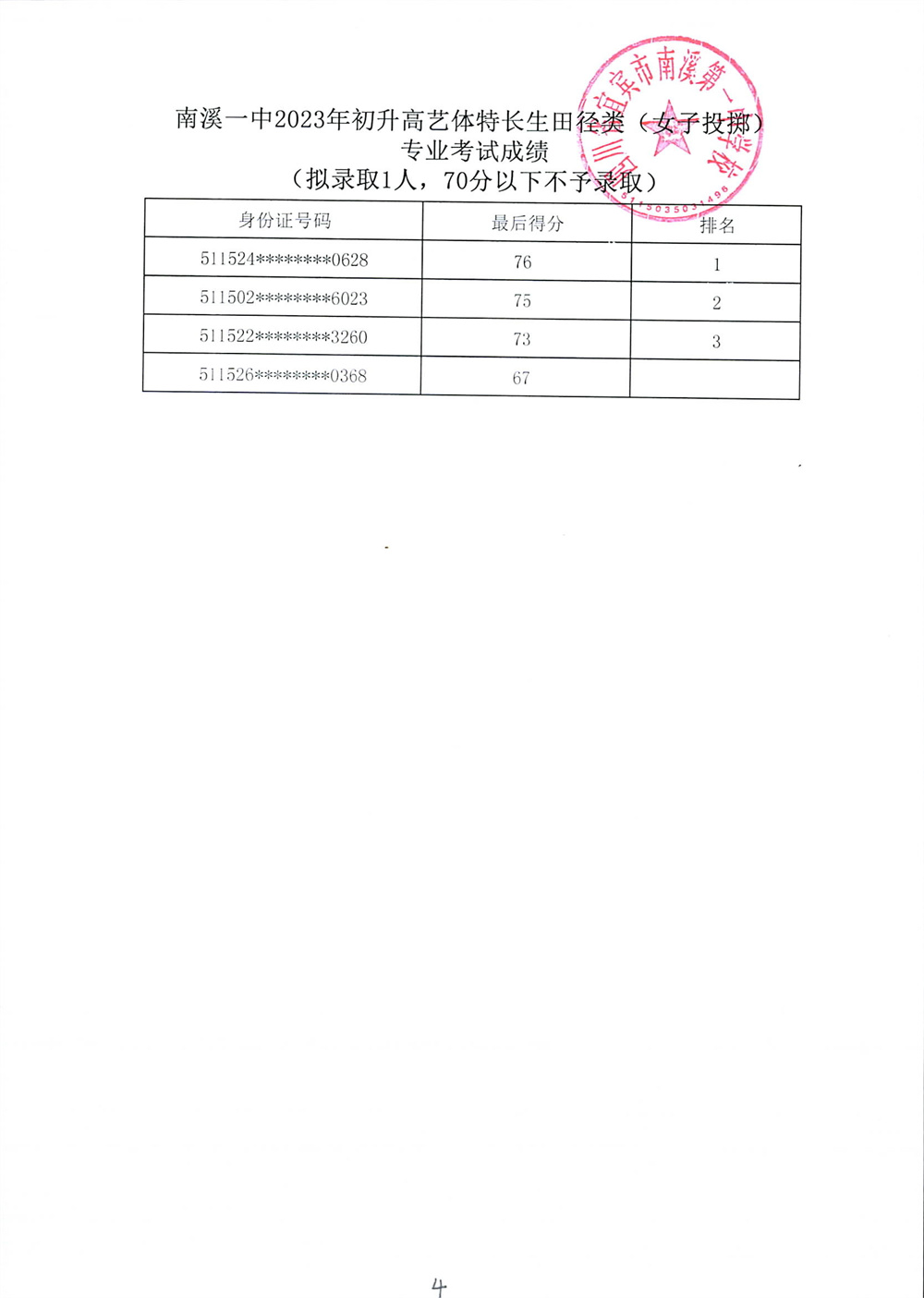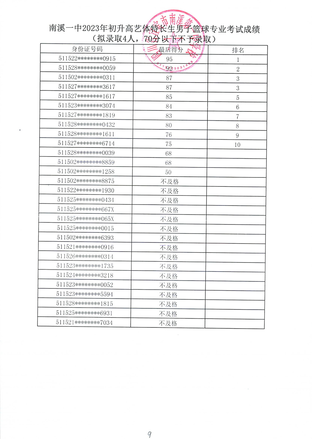 南溪一中2023年初升高藝體特長生招生專業(yè)考試成績公示