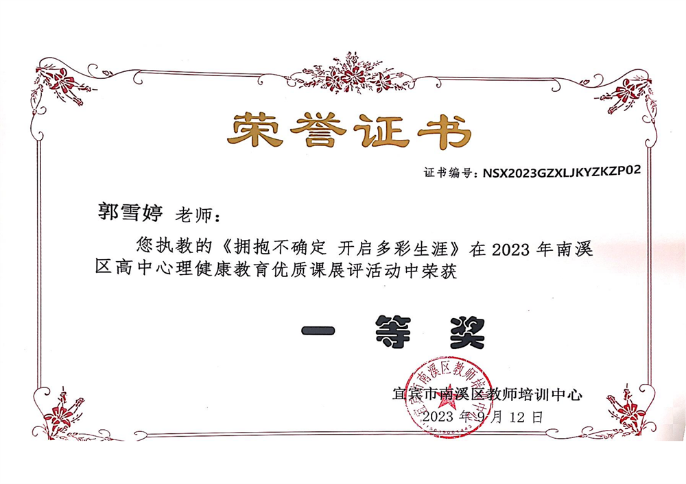 (郭雪婷)為更好地推進南溪區(qū)心理健康教育,促進學生健康成長,培養(yǎng)學生樂觀、向上的心理品質(zhì),提高南溪區(qū)心理健康教師教育教學水平,9月初,南溪區(qū)開展2023年高中心理健康優(yōu)質(zhì)課展評活動;顒臃秩齻階段進行。