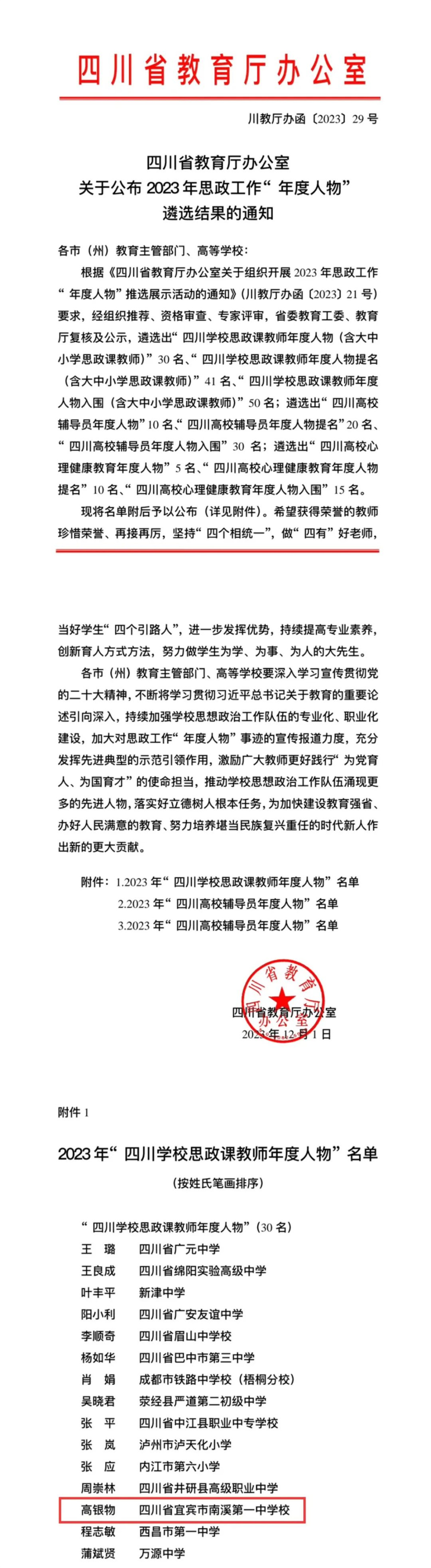 近日,四川省委教育工委、教育廳與省委宣傳部公布了2023年思政工作“年度人物”遴選結(jié)果。宜賓市南溪一中高銀物老師榮獲“四川學(xué)校思政課教師年度人物”榮譽(yù)稱號。