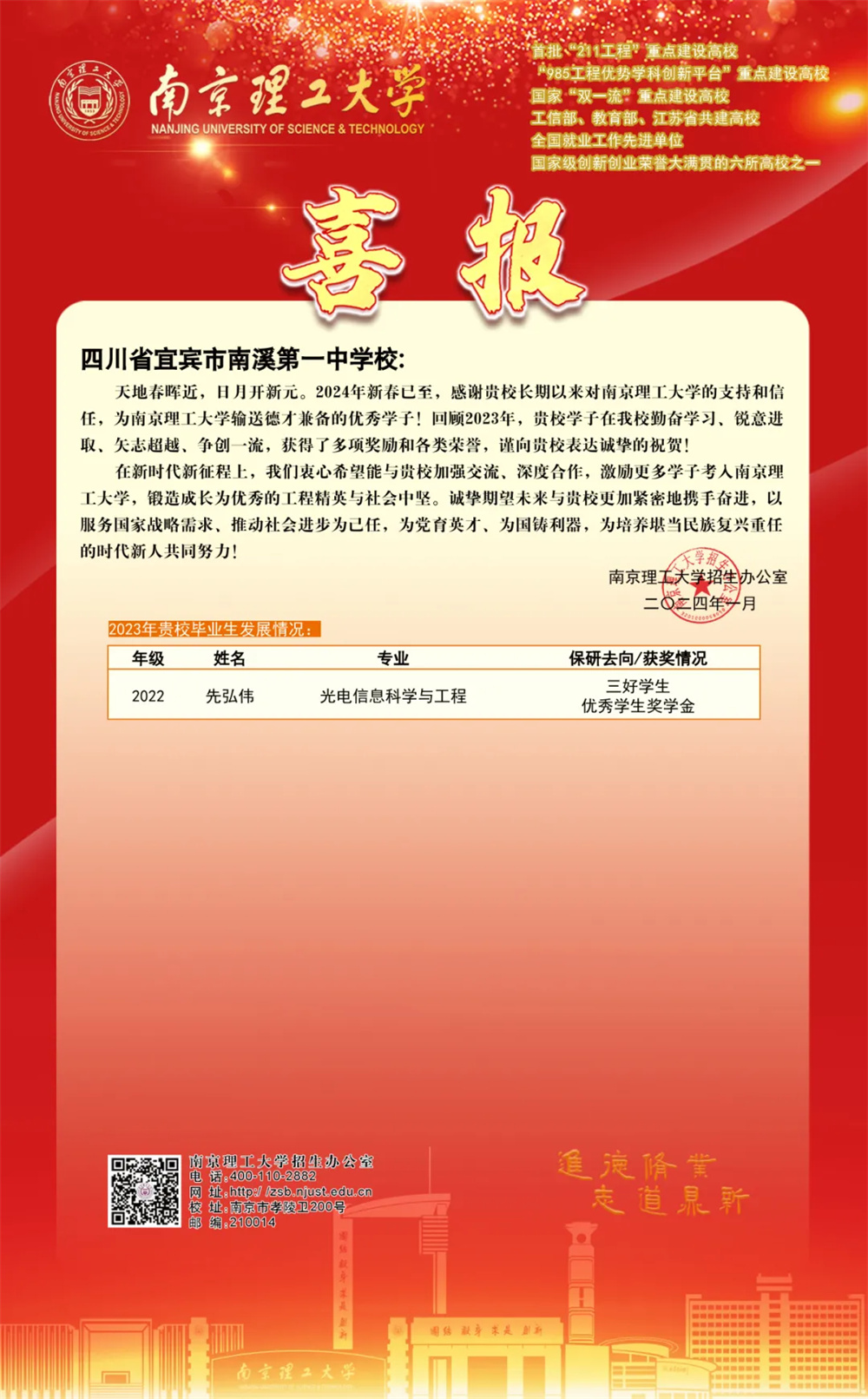 (曾薪蓉) 近日,南京理工大學(xué)向宜賓市南溪一中發(fā)來喜報(bào),祝賀學(xué)校優(yōu)秀畢業(yè)生先弘偉在大學(xué)就讀期間,矢志超越、爭創(chuàng)一流,獲得“三好學(xué)生”和“優(yōu)秀學(xué)生獎(jiǎng)學(xué)金”,期待與宜賓市南溪一中進(jìn)一步加強(qiáng)合作,為黨育英才、為國鑄利器,為培養(yǎng)堪當(dāng)民族復(fù)興重任的時(shí)代新人共同努力。