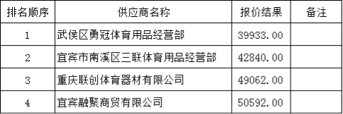 第一中標(biāo)候選人:武侯區(qū)勇冠體育用品經(jīng)營(yíng)部,最終報(bào)價(jià):39933.00。
