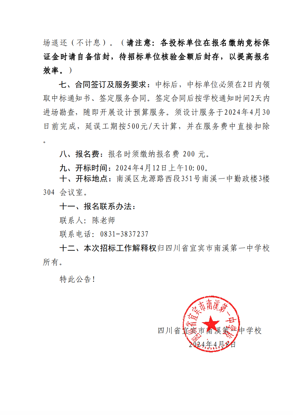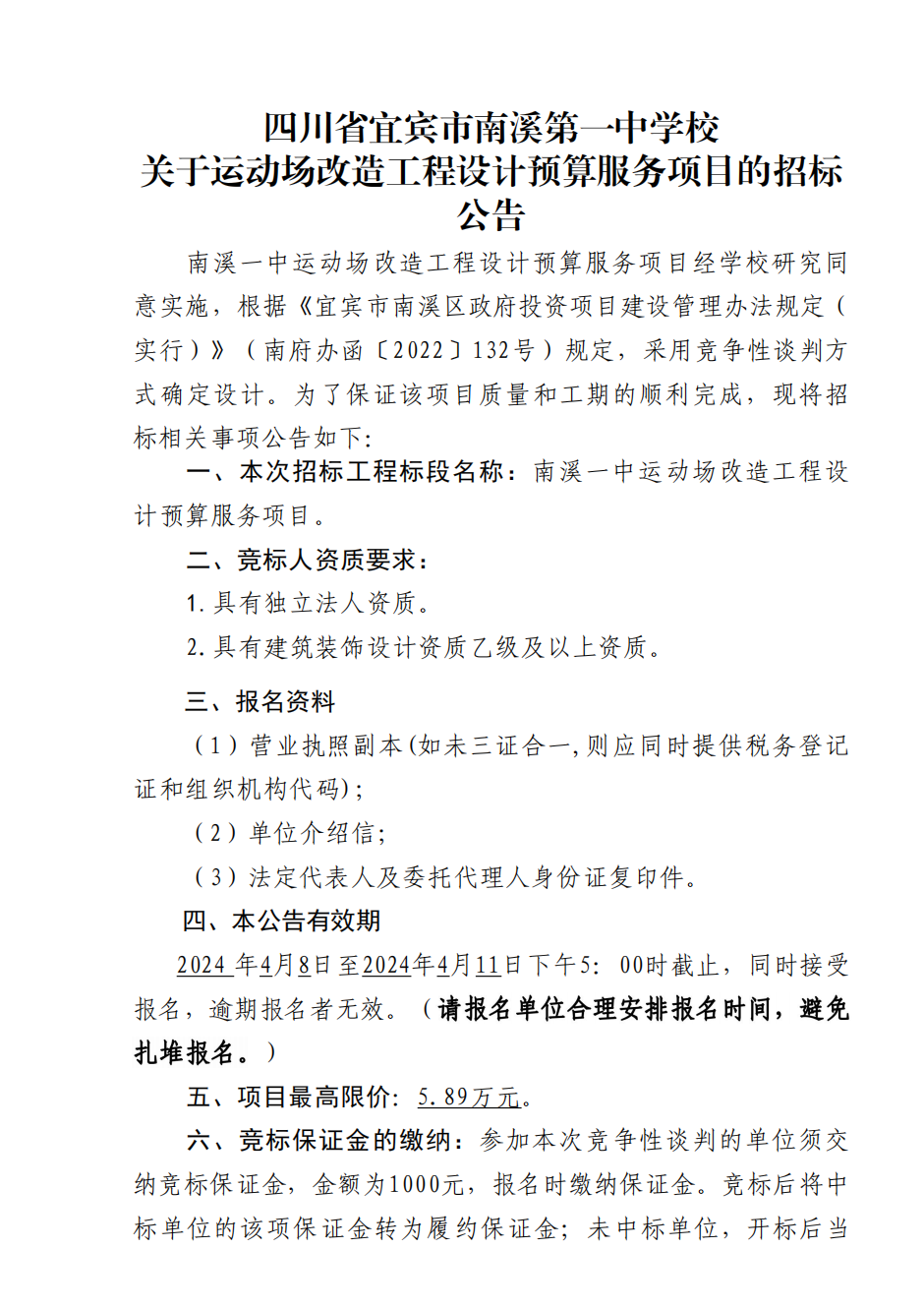 四川省宜賓市南溪第一中學(xué)校 關(guān)于運(yùn)動場改造工程設(shè)計(jì)預(yù)算服務(wù)項(xiàng)目的招標(biāo) 公告