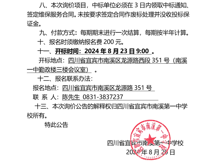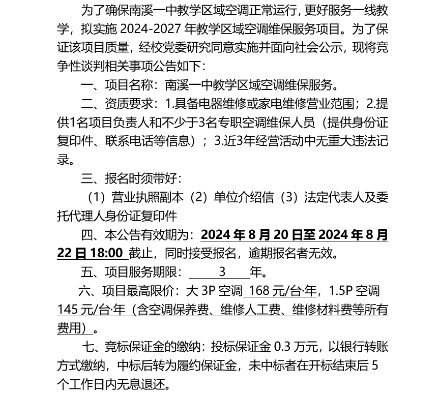 四川省宜賓市南溪第一中學校 2024-2027年教學區(qū)域空調維保服務項目 競爭性談判公告