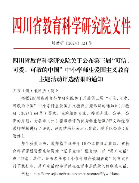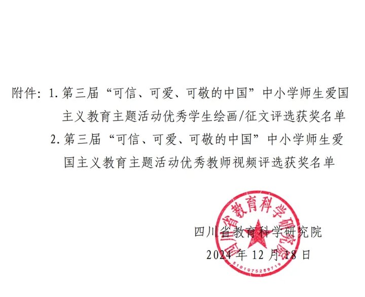 (曾薪蓉)近日,四川省教育科學(xué)研究院開(kāi)展了第三屆“可信、可愛(ài)、可敬的中國(guó)”中小學(xué)師生愛(ài)國(guó)主義教育主題活動(dòng),南溪一中師生在此次比賽中榮獲佳績(jī):