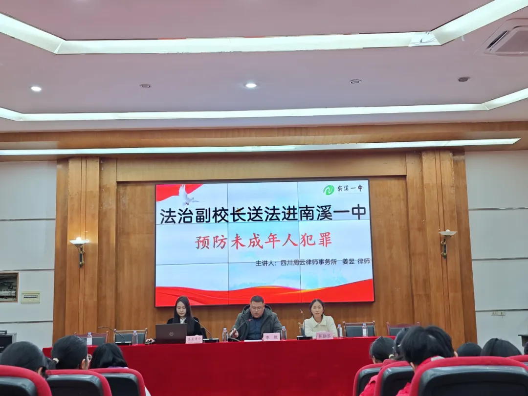 (劉婷)為深入貫徹落實依法治國理念,增強青少年法治意識,筑牢校園安全防線,3月6日,南溪一中特邀法治副校長及司法局、律所專家走進校園,開展“法治副校長送法進校園”專題宣講活動!本次活動以“預防未成年人犯罪”為主題,通過專業(yè)法律講解、真實案例分析、趣味互動問答等形式,為師生帶來了一堂生動的法治教育課,助力青少年扣好人生的“法治紐扣”。