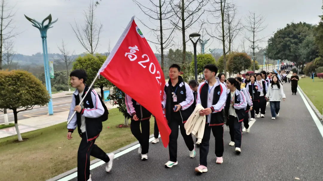 高2024級師生沿著長江綠道向羅龍中學(xué)前進(jìn),22公里的征程是毅力的試煉場。嘹亮的班歌、整齊的腳步聲與沿途的鳥鳴聲交織成奮進(jìn)的樂章。當(dāng)有同學(xué)腳步踉蹌,立即有同伴送上鼓勵;當(dāng)有同學(xué)因體力不支放慢腳步,班級同學(xué)主動接過背包、攙扶前行。行至中途,歌聲的旋律愈發(fā)激昂。