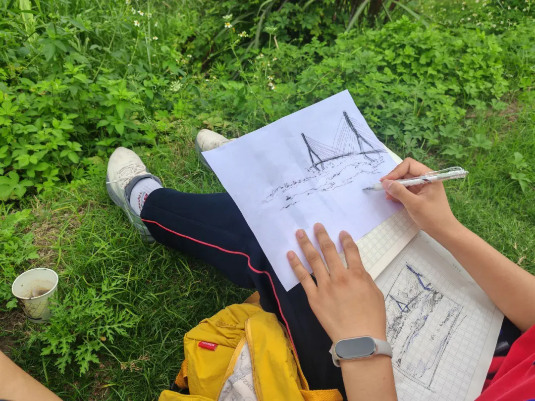 地貌觀察組沿著江岸仔細(xì)觀察各類地貌特征,根據(jù)所看到的地理情況繪制地貌草圖。同學(xué)們將所觀察到的地理狀況:江水常年沖刷形成獨(dú)特的溝壑紋理、堆積岸平緩的地勢(shì)、河漫灘上細(xì)膩的泥沙與礫石、河流的走向等,通過(guò)同學(xué)們的勾勒躍然于紙上。