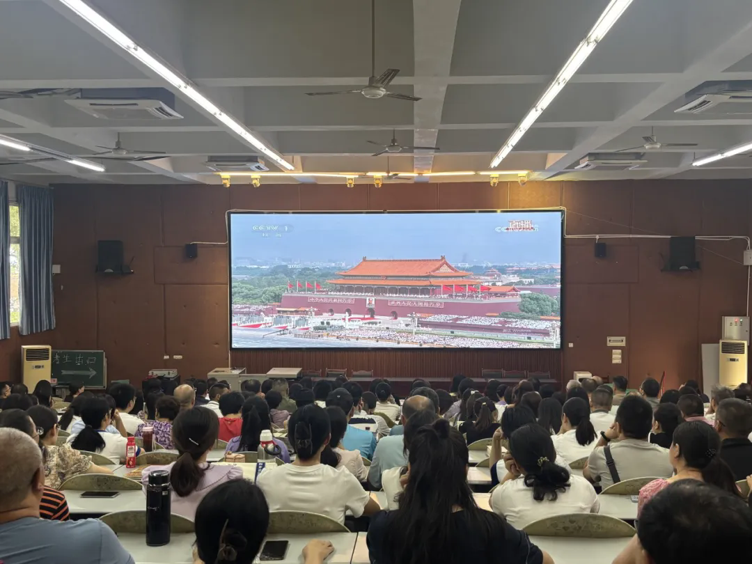 各班學(xué)生在教室進(jìn)行觀看,教職工在中和堂集中觀看,共同見證這一具有重大政治意義和深遠(yuǎn)歷史意義的紀(jì)念活動(dòng)。