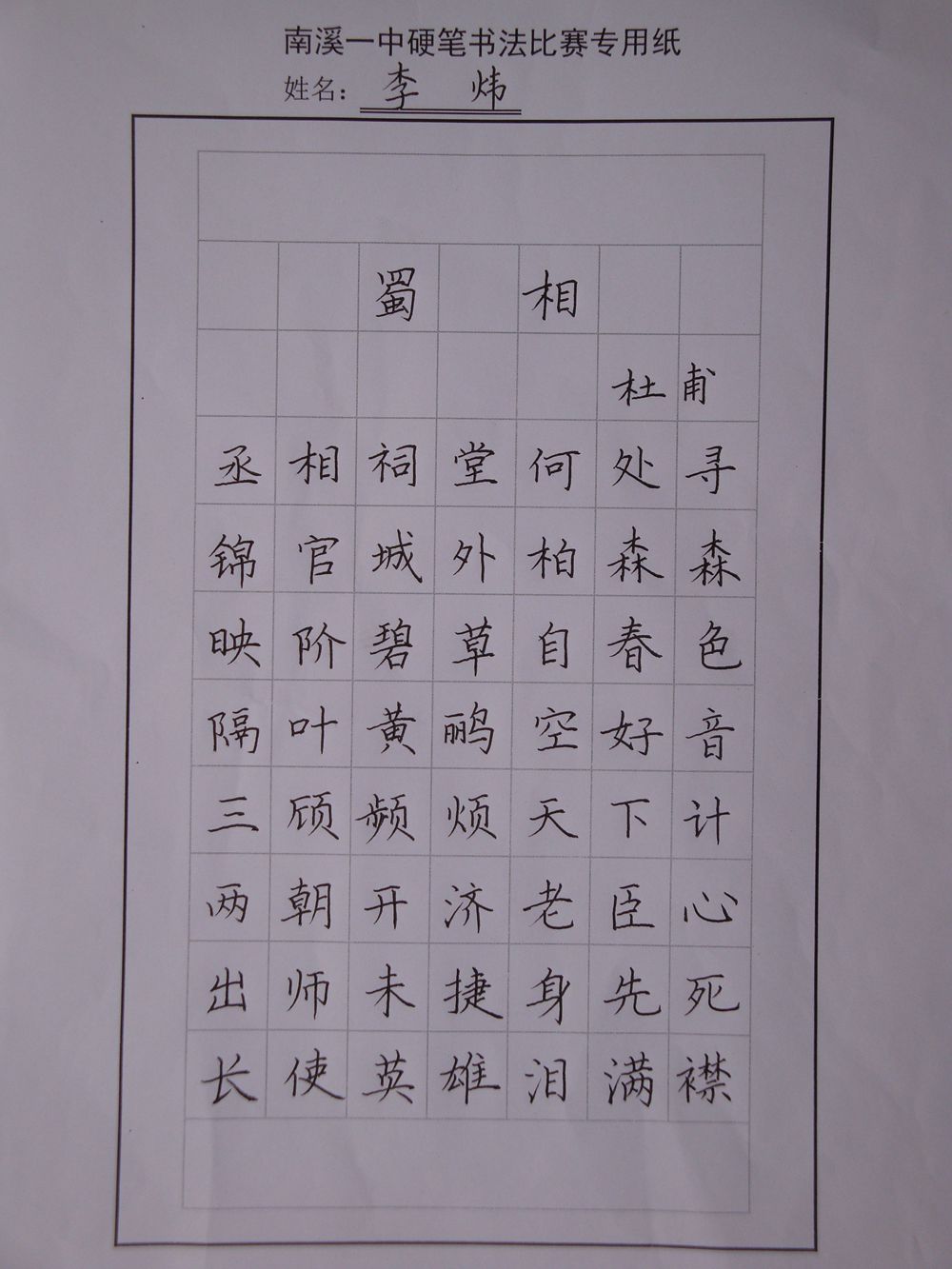 為了豐富校園文化生活,加強教師教學基本技能,促進教師專業(yè)化成長,3月下旬,南溪一中舉行了一場別開生面的教師粉筆字、鋼筆字比賽。這次比賽評出一等獎各10名,二等獎各20名,三等獎各30名。