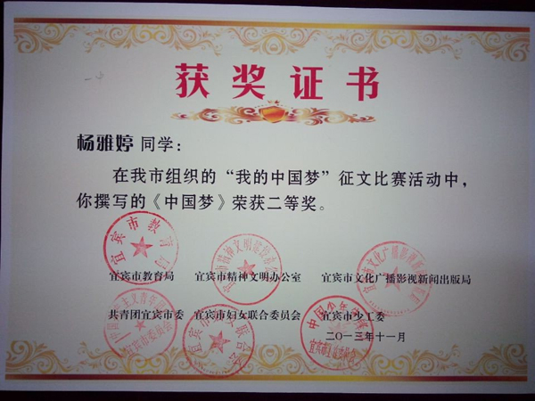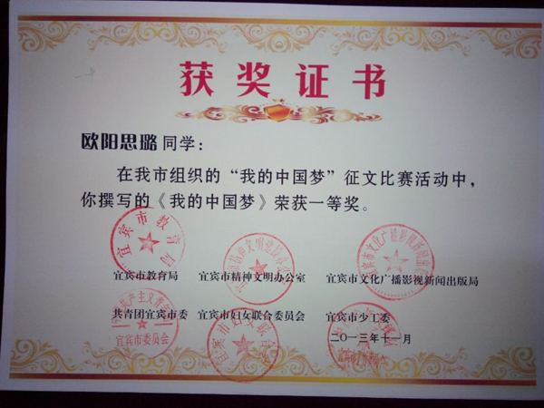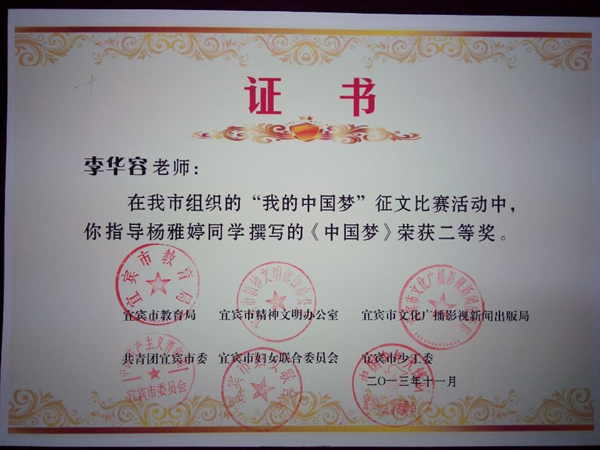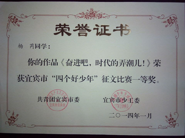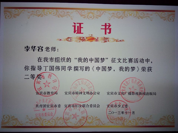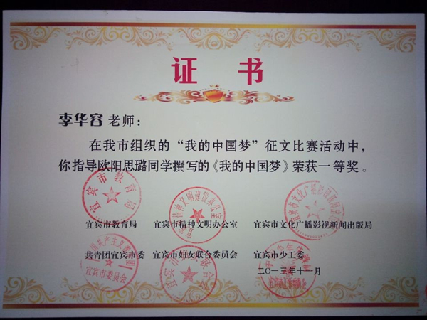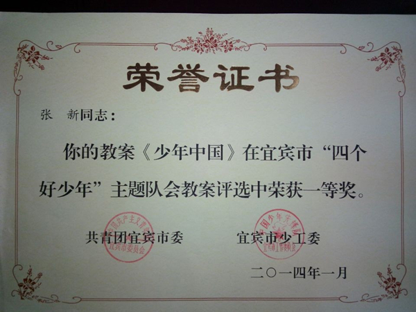 2013級14班(班主任楊世欽)楊芮同學(xué)的《奮進(jìn)吧,時代的弄潮兒!》(指導(dǎo)教師何茂)獲宜賓市“四個好少年”征文一等獎;由2013級年級組選送的張新老師(13班班主任)的《少年 中國》獲宜賓市主題隊(duì)會教案一等獎。以上作品均被收入《宜賓市“四個好少年”主題活動優(yōu)秀作品匯編》。