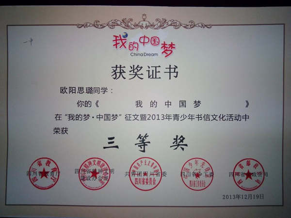 2012級8班(班主任尹修玲)歐陽思路同學(xué)獲“我的夢 中國夢”征文省三等獎、市一等獎,楊雅婷、丁國偉同學(xué)獲市二等獎(指導(dǎo)教師均為李華容)。