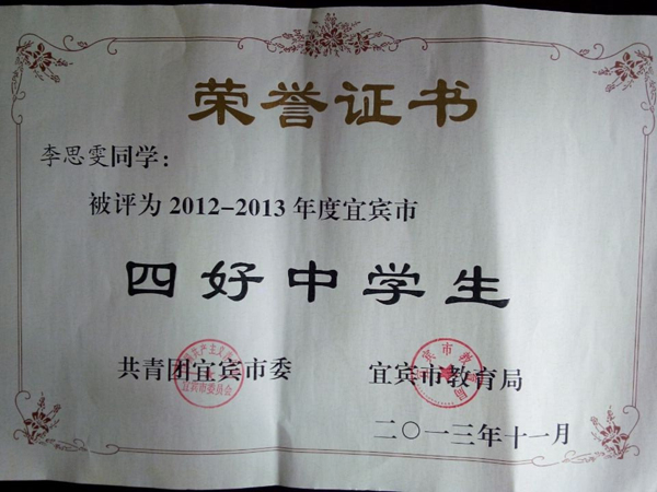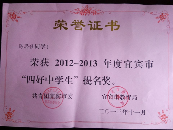 學(xué)生會主席李思雯(2011級5班,班主任鐘標(biāo))被評為宜賓市“四好中學(xué)生”、校學(xué)生會副主席陳思佳(2011級5班,班主任鐘標(biāo))獲提名獎。